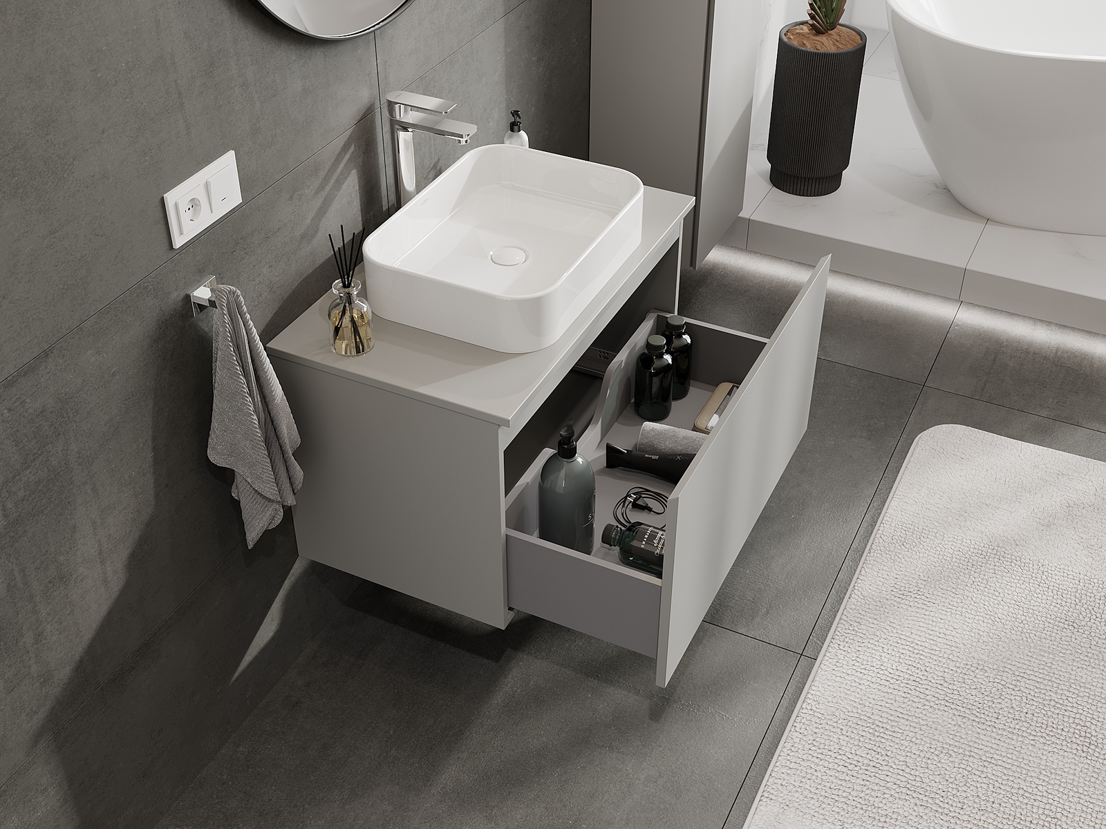 Výřez v zásuvce je navržen tak, aby pojmul sifon, který je nezbytný v instalacích umyvadlových. Díky tomu může být nábytek plně funkčně namontován, aniž by bylo nutné vzdát se prostoru v zásuvce ve prospěch instalace.