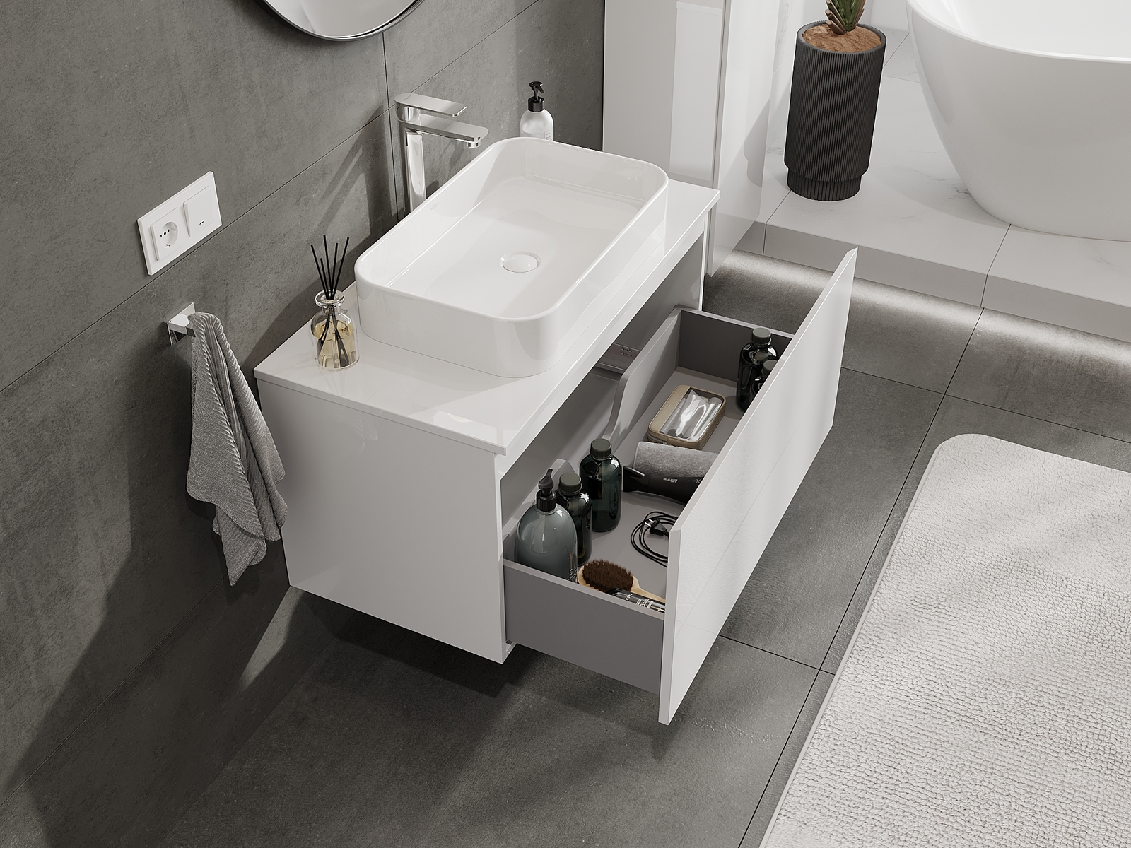 Výřez v zásuvce je navržen tak, aby pojmul sifon, který je nezbytný v instalacích umyvadlových. Díky tomu může být nábytek plně funkčně namontován, aniž by bylo nutné vzdát se prostoru v zásuvce ve prospěch instalace.