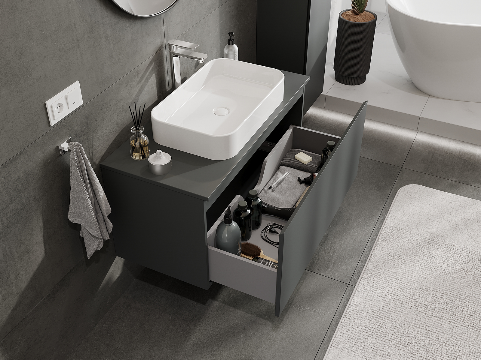 Výřez v zásuvce je navržen tak, aby pojmul sifon, který je nezbytný v instalacích umyvadlových. Díky tomu může být nábytek plně funkčně namontován, aniž by bylo nutné vzdát se prostoru v zásuvce ve prospěch instalace.