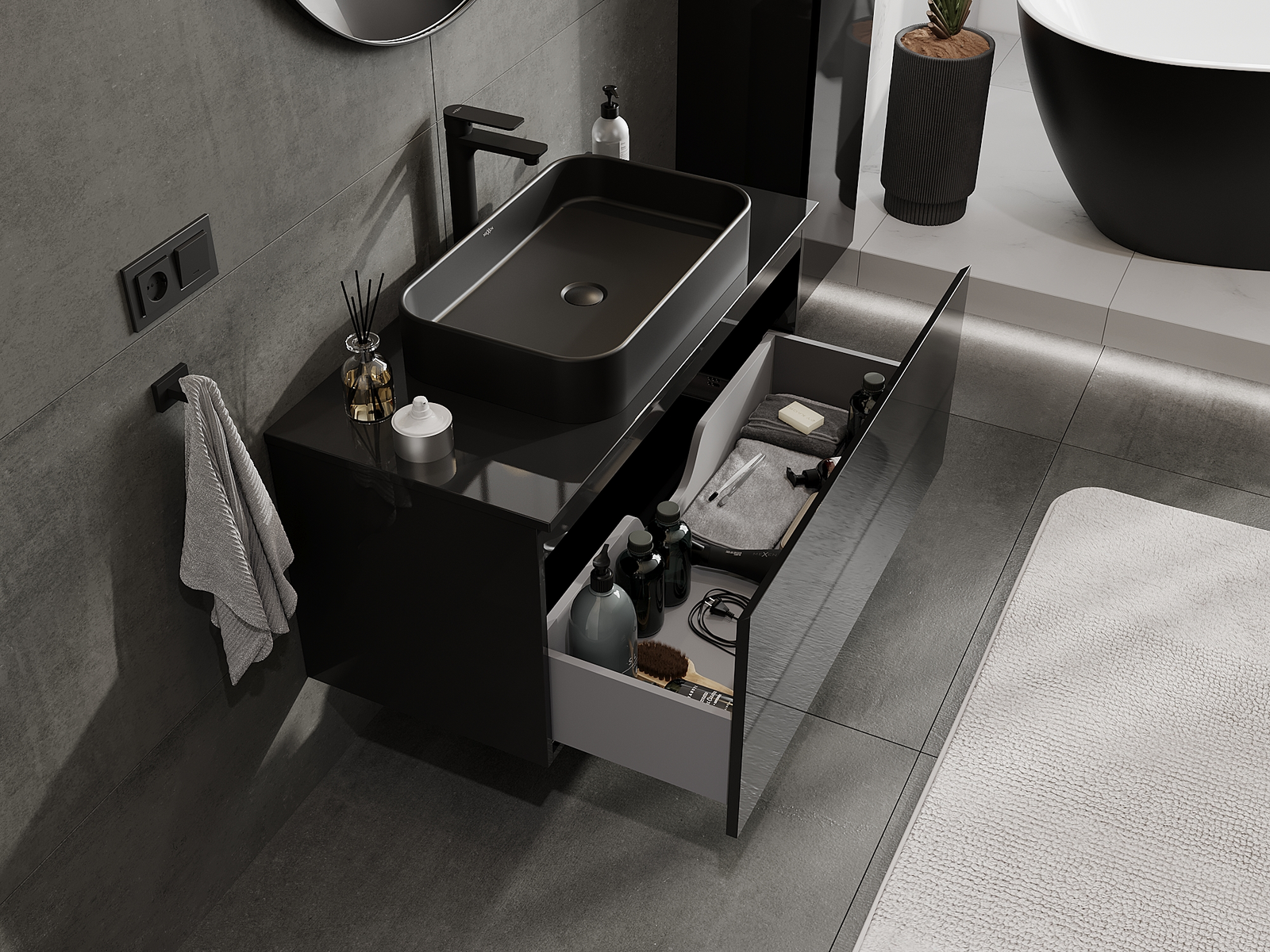Výřez v zásuvce je navržen tak, aby pojmul sifon, který je nezbytný v instalacích umyvadlových. Díky tomu může být nábytek plně funkčně namontován, aniž by bylo nutné vzdát se prostoru v zásuvce ve prospěch instalace.