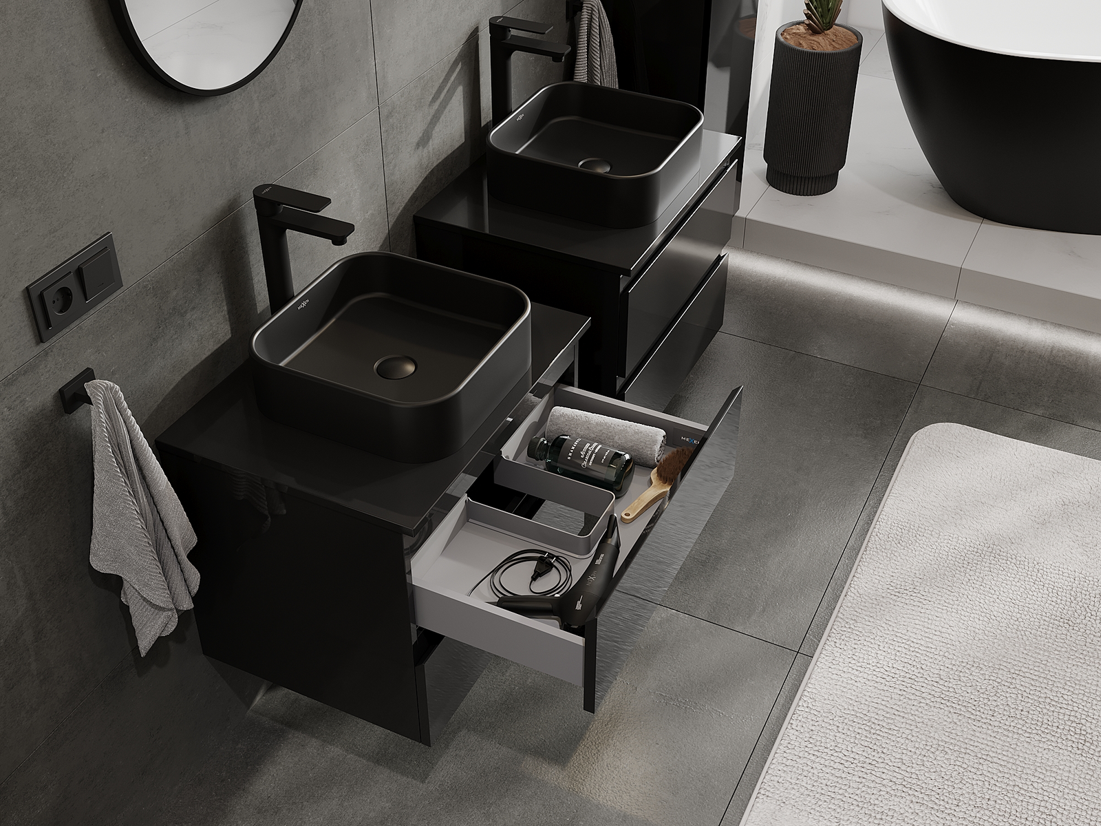 Výřez v zásuvce je navržen tak, aby pojmul sifon, který je nezbytný v instalacích umyvadlových. Díky tomu může být nábytek plně funkčně namontován, aniž by bylo nutné vzdát se prostoru v zásuvce ve prospěch instalace.
