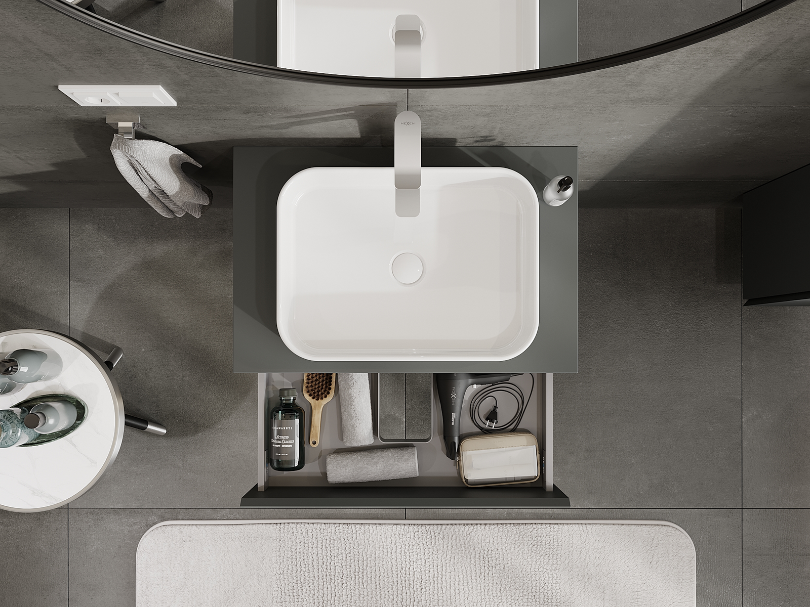 Výřez v zásuvce je navržen tak, aby pojmul sifon, který je nezbytný v instalacích umyvadlových. Díky tomu může být nábytek plně funkčně namontován, aniž by bylo nutné vzdát se prostoru v zásuvce ve prospěch instalace.