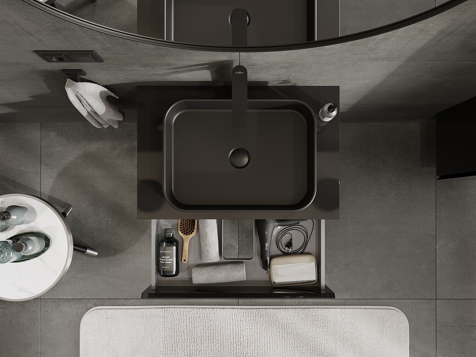 Výřez v zásuvce je navržen tak, aby pojmul sifon, který je nezbytný v instalacích umyvadlových. Díky tomu může být nábytek plně funkčně namontován, aniž by bylo nutné vzdát se prostoru v zásuvce ve prospěch instalace.