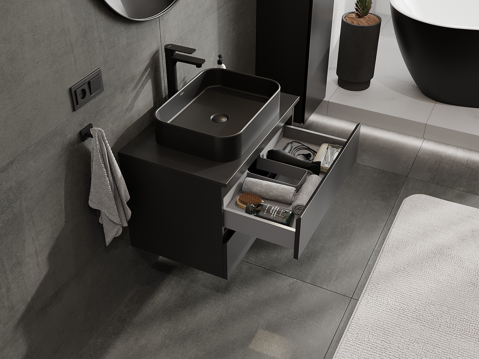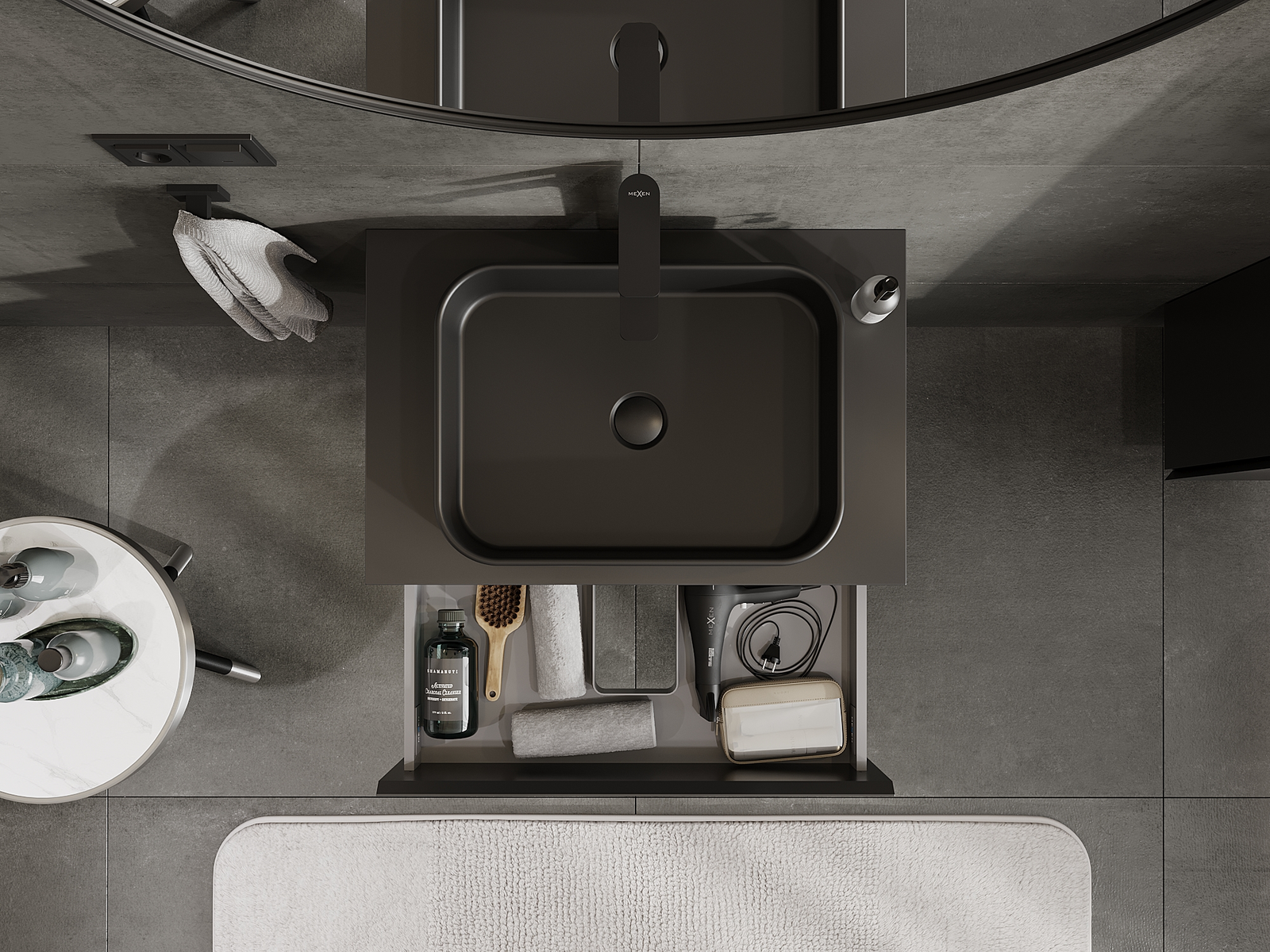 Výřez v zásuvce je navržen tak, aby pojmul sifon, který je nezbytný v instalacích umyvadlových. Díky tomu může být nábytek plně funkčně namontován, aniž by bylo nutné vzdát se prostoru v zásuvce ve prospěch instalace.