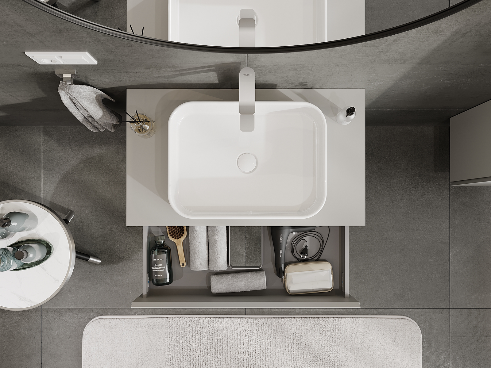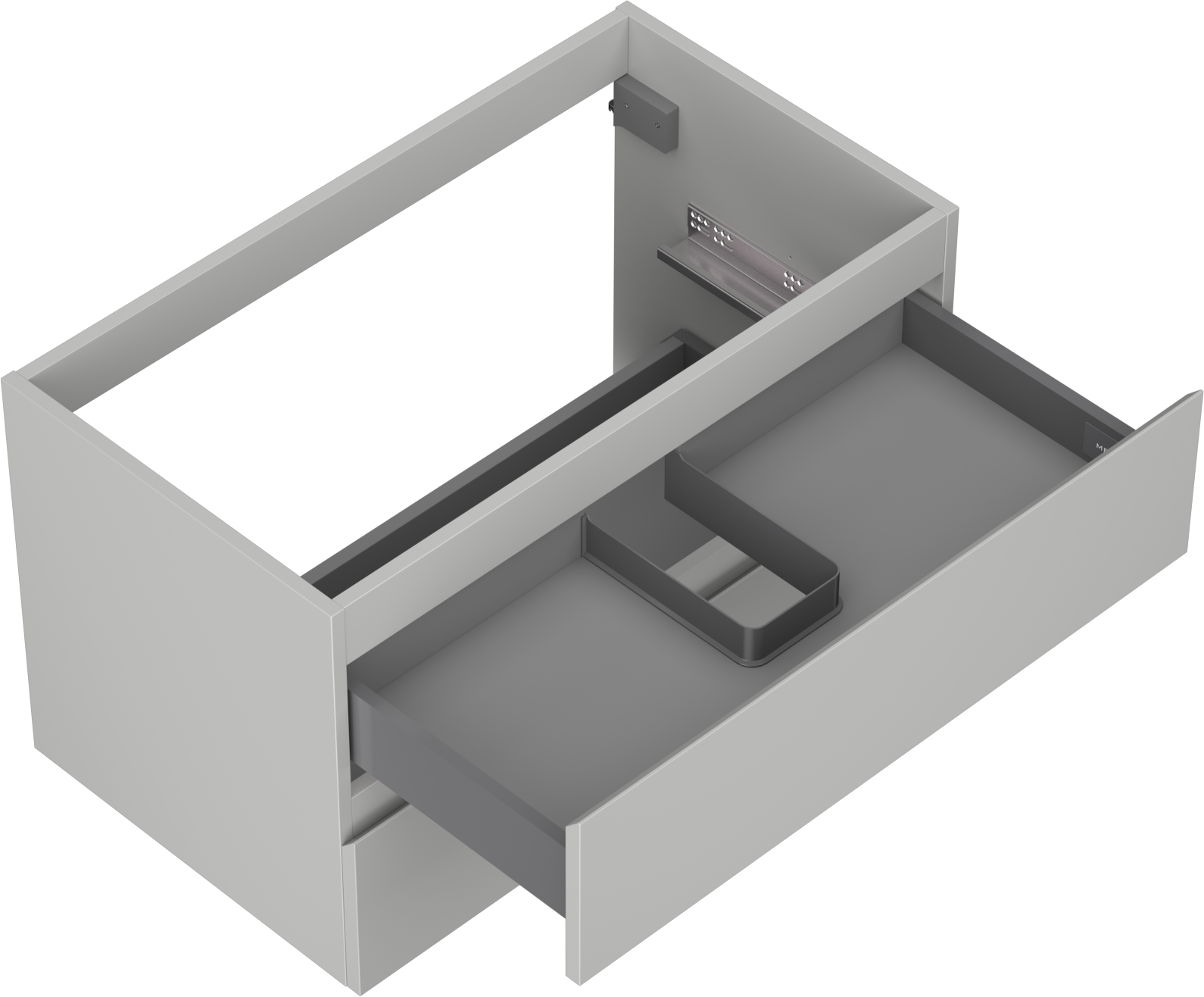Výřez v zásuvce je navržen tak, aby pojmul sifon, který je nezbytný v instalacích umyvadlových. Díky tomu může být nábytek plně funkčně namontován, aniž by bylo nutné vzdát se prostoru v zásuvce ve prospěch instalace.