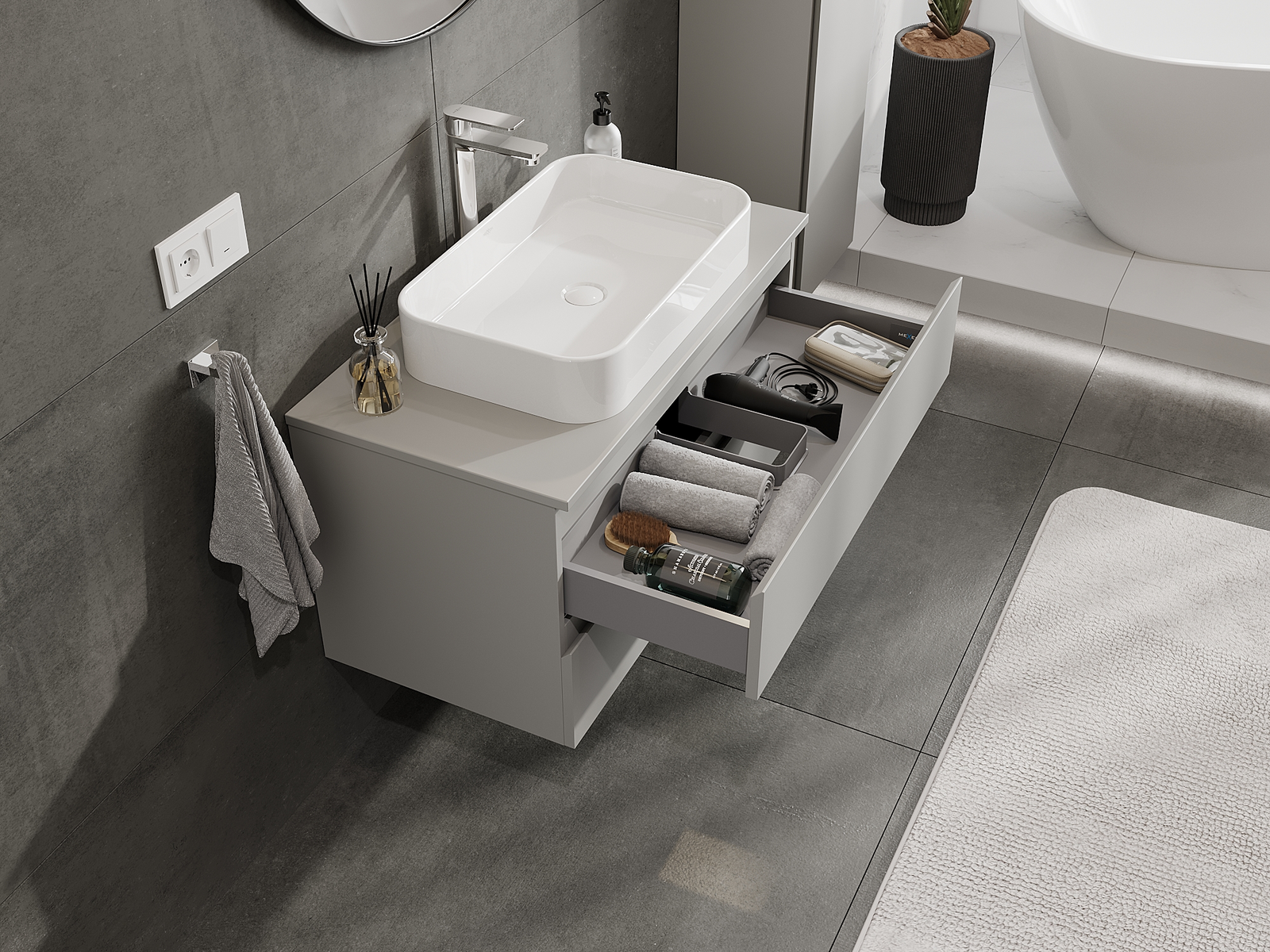 Výřez v zásuvce je navržen tak, aby pojmul sifon, který je nezbytný v instalacích umyvadlových. Díky tomu může být nábytek plně funkčně namontován, aniž by bylo nutné vzdát se prostoru v zásuvce ve prospěch instalace.