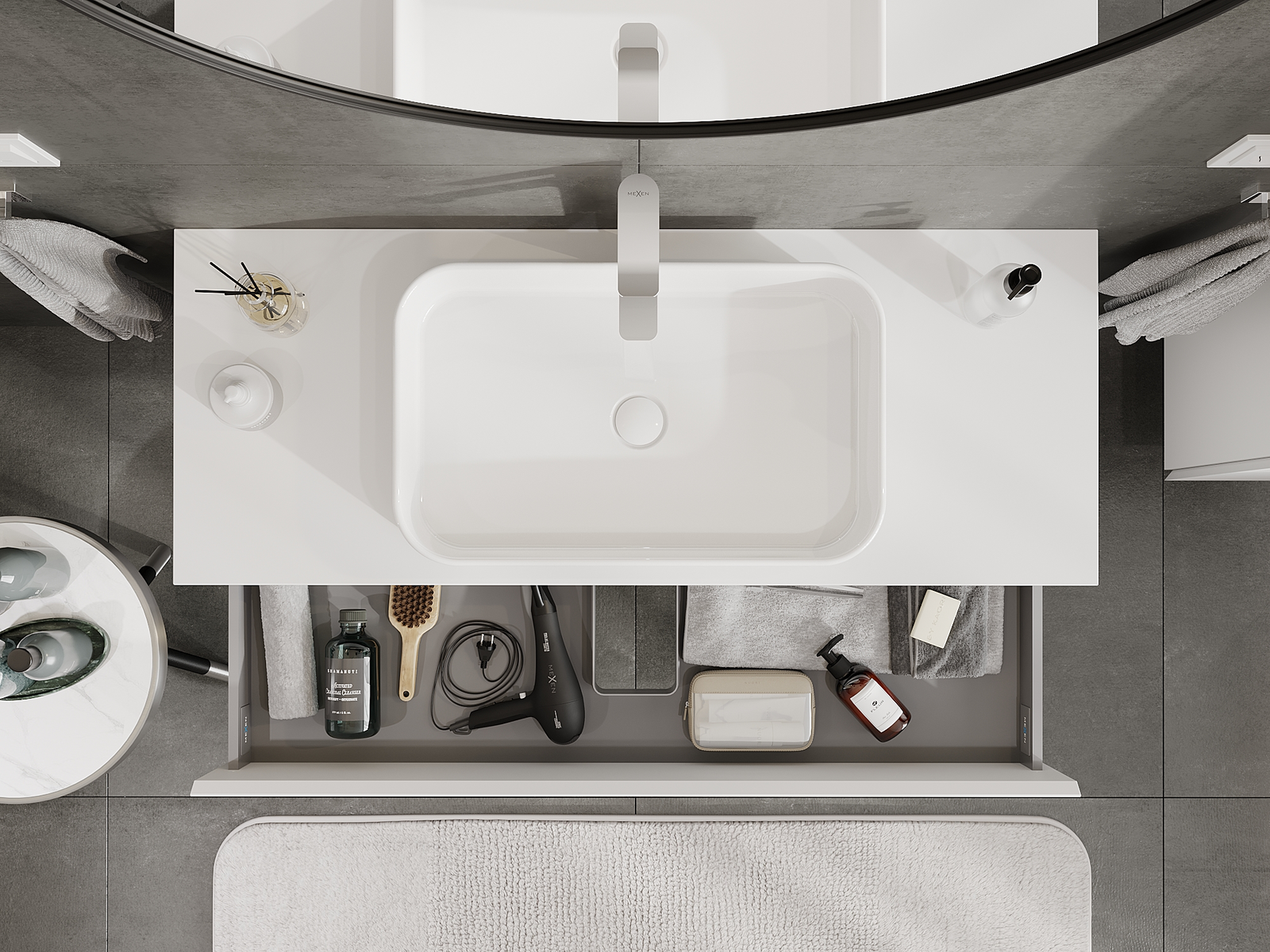 Výřez v zásuvce je navržen tak, aby pojmul sifon, který je nezbytný v instalacích umyvadlových. Díky tomu může být nábytek plně funkčně namontován, aniž by bylo nutné vzdát se prostoru v zásuvce ve prospěch instalace.