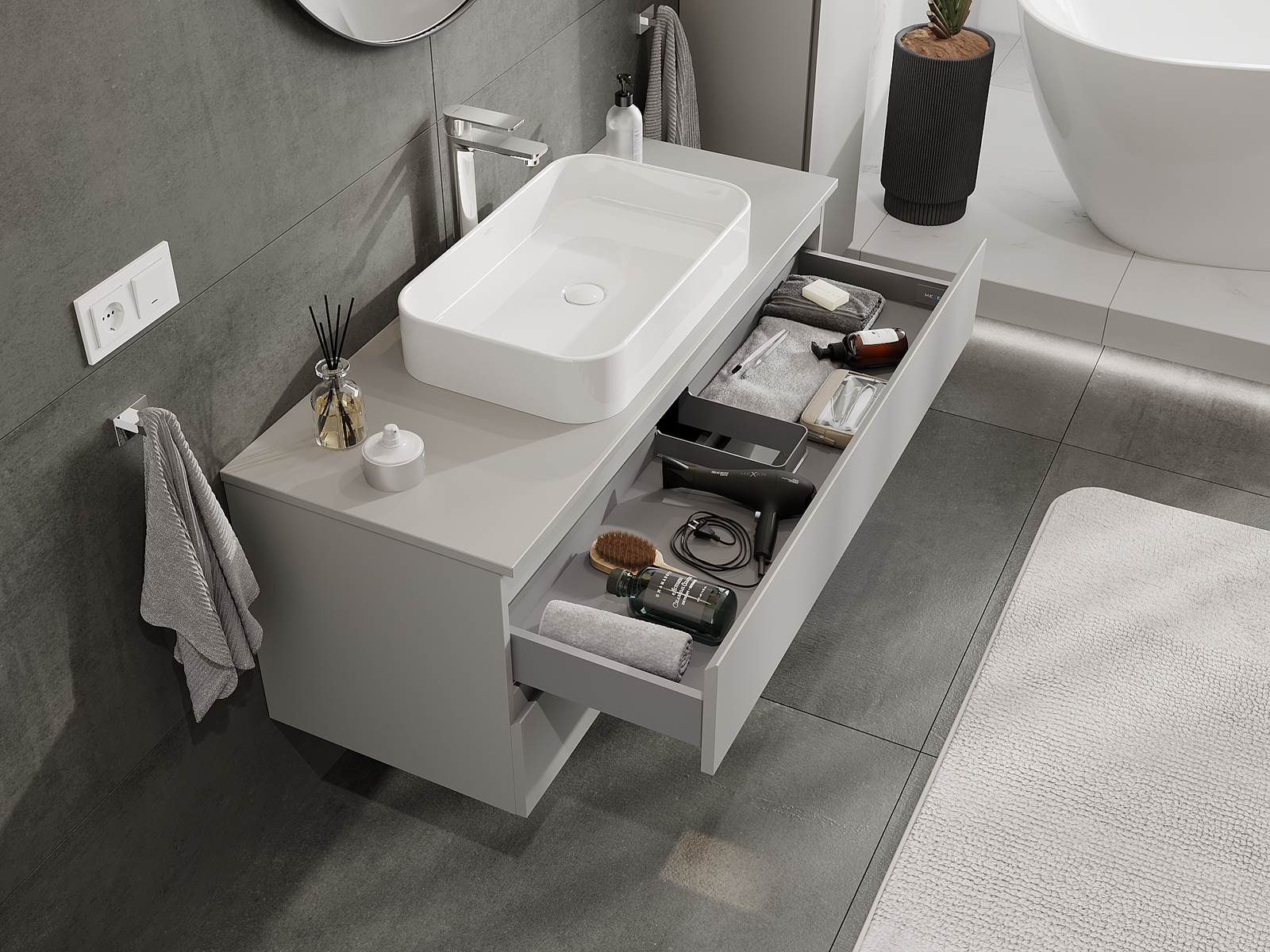 Výřez v zásuvce je navržen tak, aby pojmul sifon, který je nezbytný v instalacích umyvadlových. Díky tomu může být nábytek plně funkčně namontován, aniž by bylo nutné vzdát se prostoru v zásuvce ve prospěch instalace.