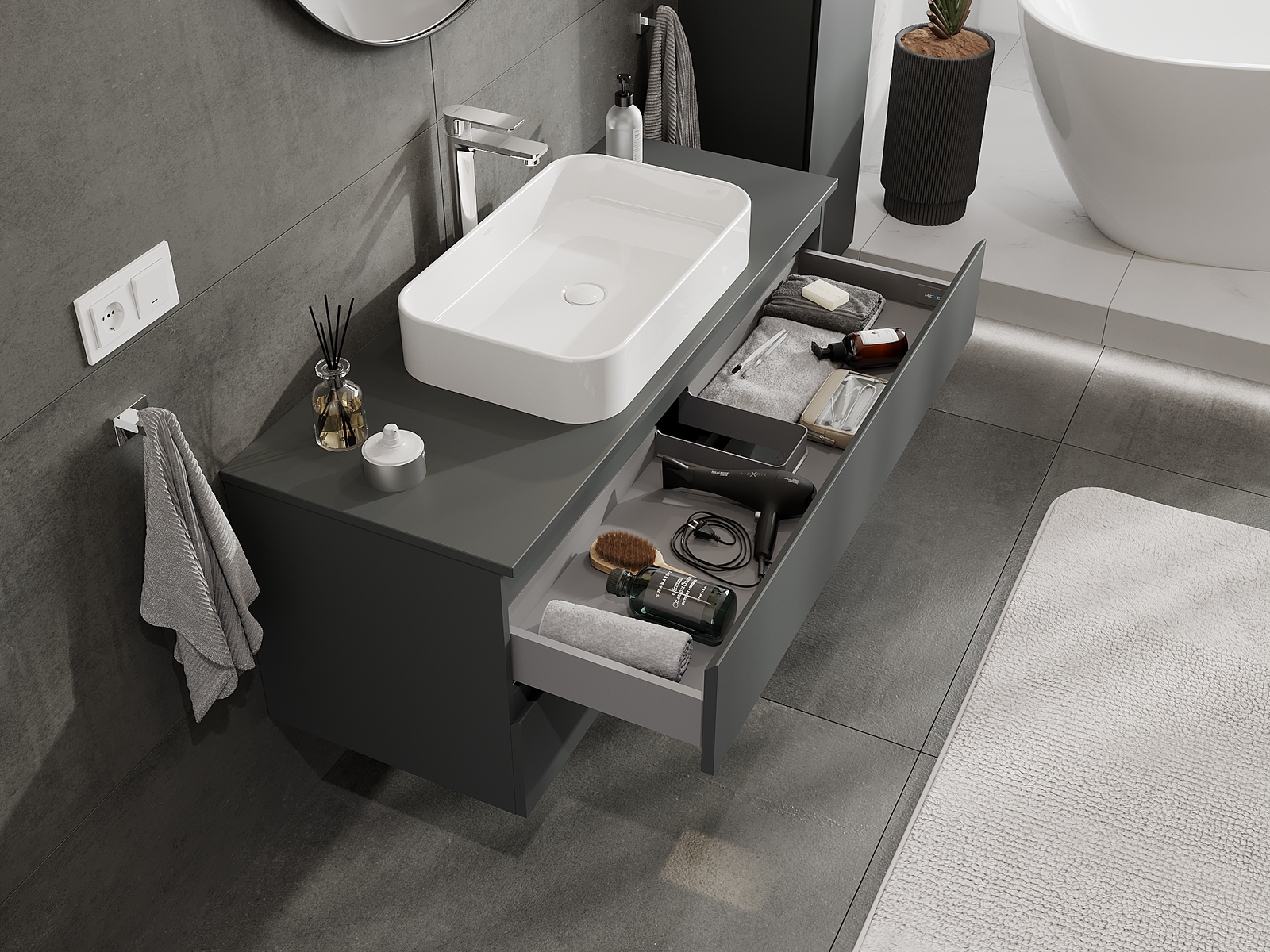 Výřez v zásuvce je navržen tak, aby pojmul sifon, který je nezbytný v instalacích umyvadlových. Díky tomu může být nábytek plně funkčně namontován, aniž by bylo nutné vzdát se prostoru v zásuvce ve prospěch instalace.