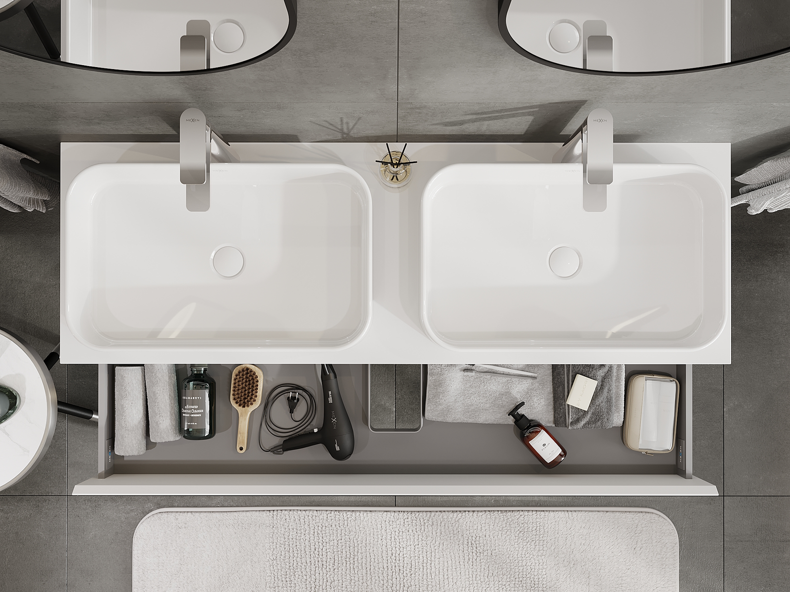 Výřez v zásuvce je navržen tak, aby pojmul sifon, který je nezbytný v instalacích umyvadlových. Díky tomu může být nábytek plně funkčně namontován, aniž by bylo nutné vzdát se prostoru v zásuvce ve prospěch instalace.