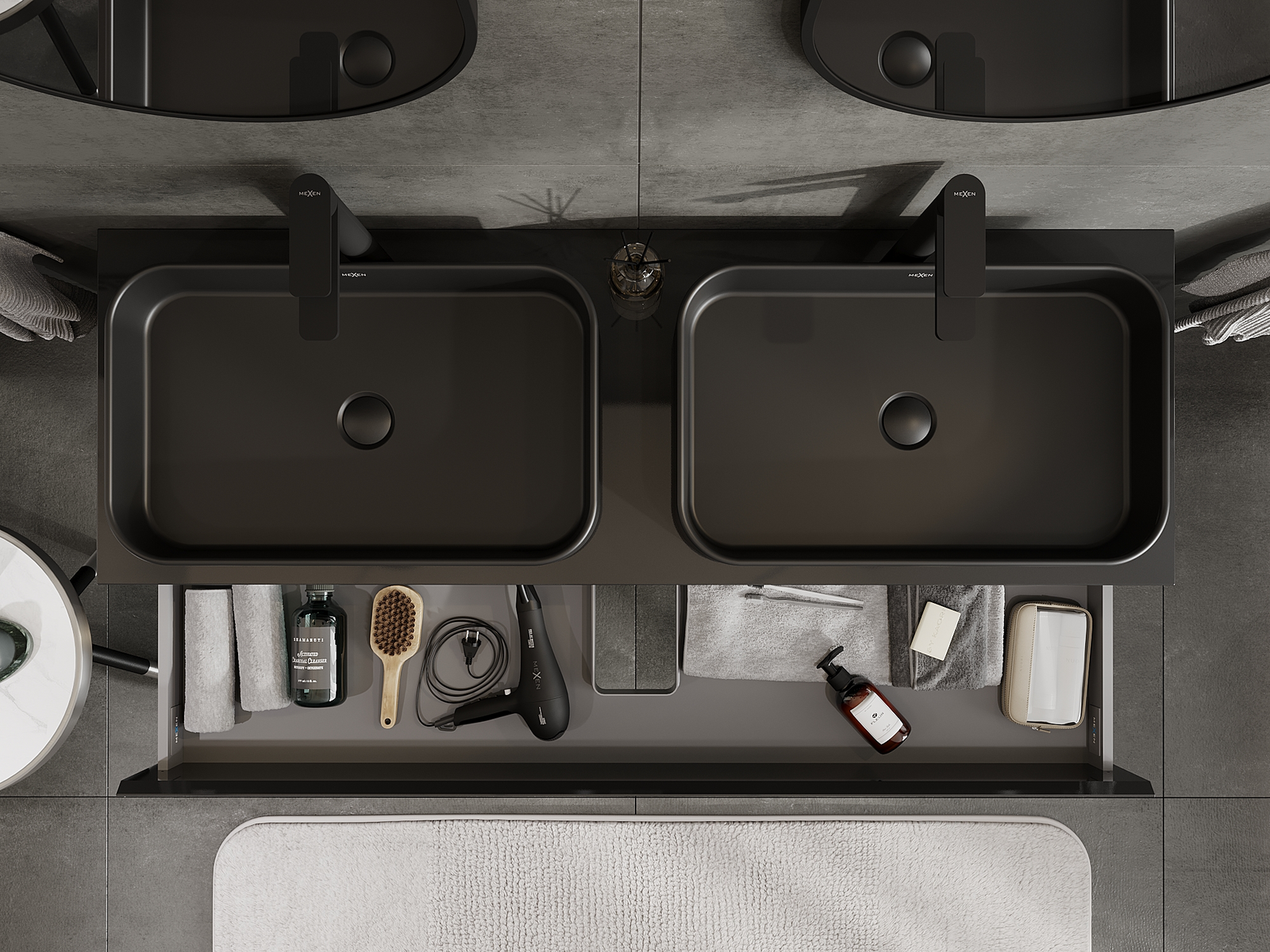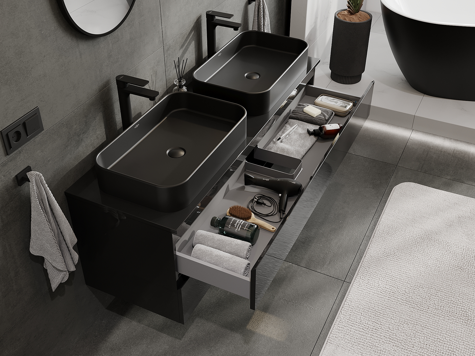 Výřez v zásuvce je navržen tak, aby pojmul sifon, který je nezbytný v instalacích umyvadlových. Díky tomu může být nábytek plně funkčně namontován, aniž by bylo nutné vzdát se prostoru v zásuvce ve prospěch instalace.