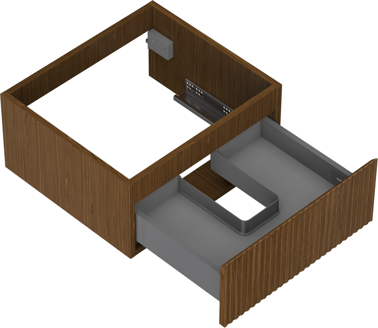 Výřez v zásuvce je navržen tak, aby pojmul sifon, který je nezbytný v instalacích umyvadlových. Díky tomu může být nábytek plně funkčně namontován, aniž by bylo nutné vzdát se prostoru v zásuvce ve prospěch instalace.