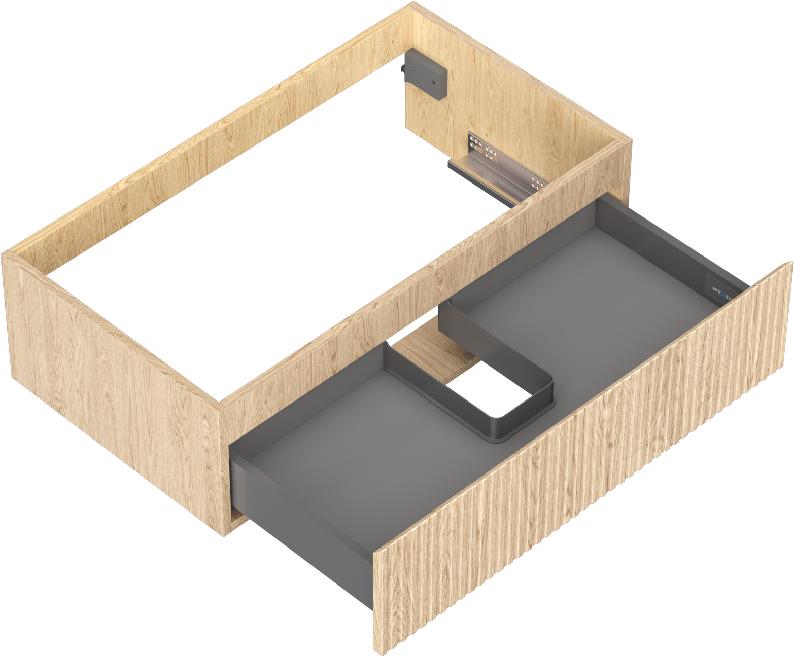 Výřez v zásuvce je navržen tak, aby pojmul sifon, který je nezbytný v instalacích umyvadlových. Díky tomu může být nábytek plně funkčně namontován, aniž by bylo nutné vzdát se prostoru v zásuvce ve prospěch instalace.
