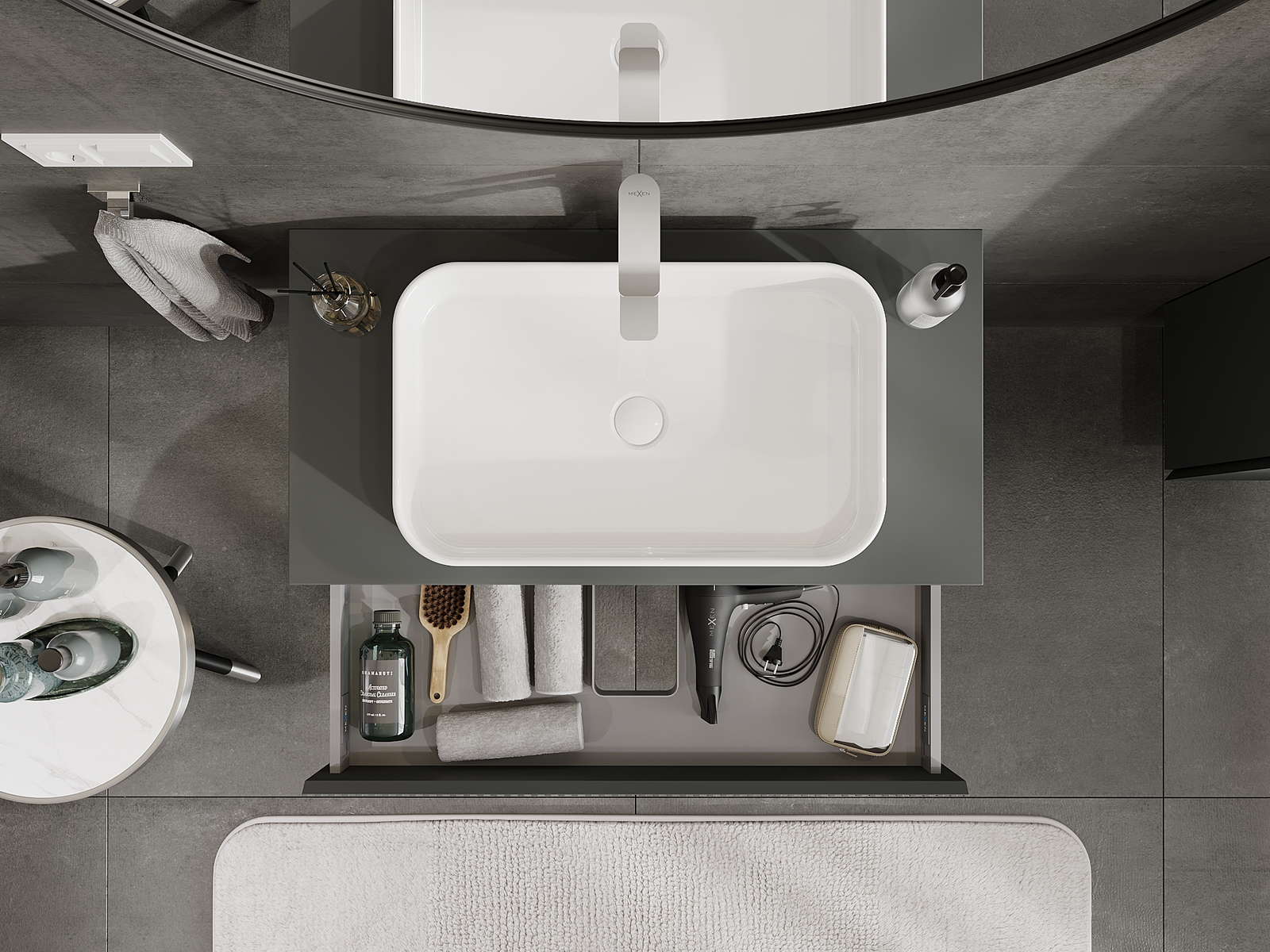 Výřez v zásuvce je navržen tak, aby pojmul sifon, který je nezbytný v instalacích umyvadlových. Díky tomu může být nábytek plně funkčně namontován, aniž by bylo nutné vzdát se prostoru v zásuvce ve prospěch instalace.