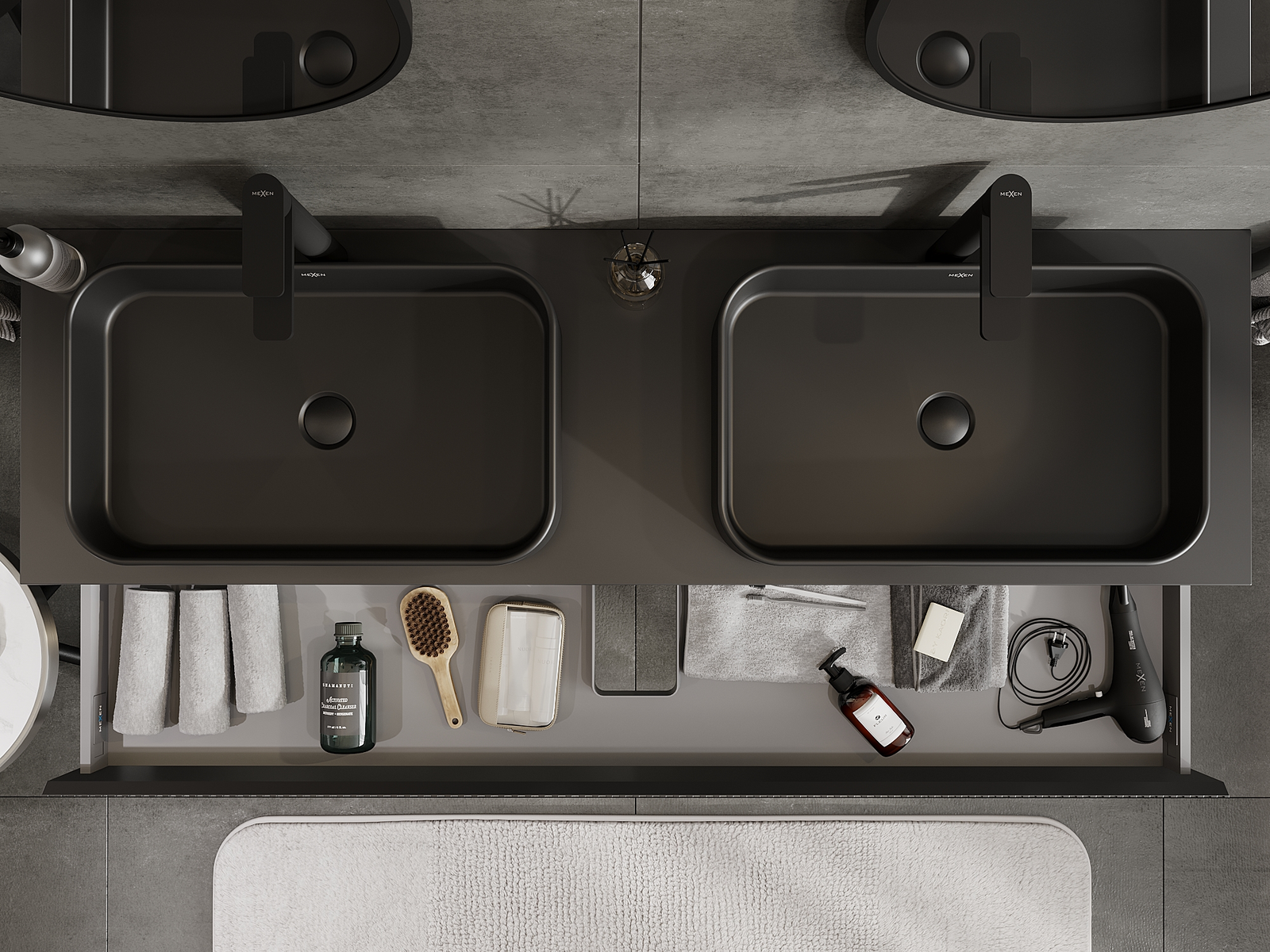 Výřez v zásuvce je navržen tak, aby pojmul sifon, který je nezbytný v instalacích umyvadlových. Díky tomu může být nábytek plně funkčně namontován, aniž by bylo nutné vzdát se prostoru v zásuvce ve prospěch instalace.