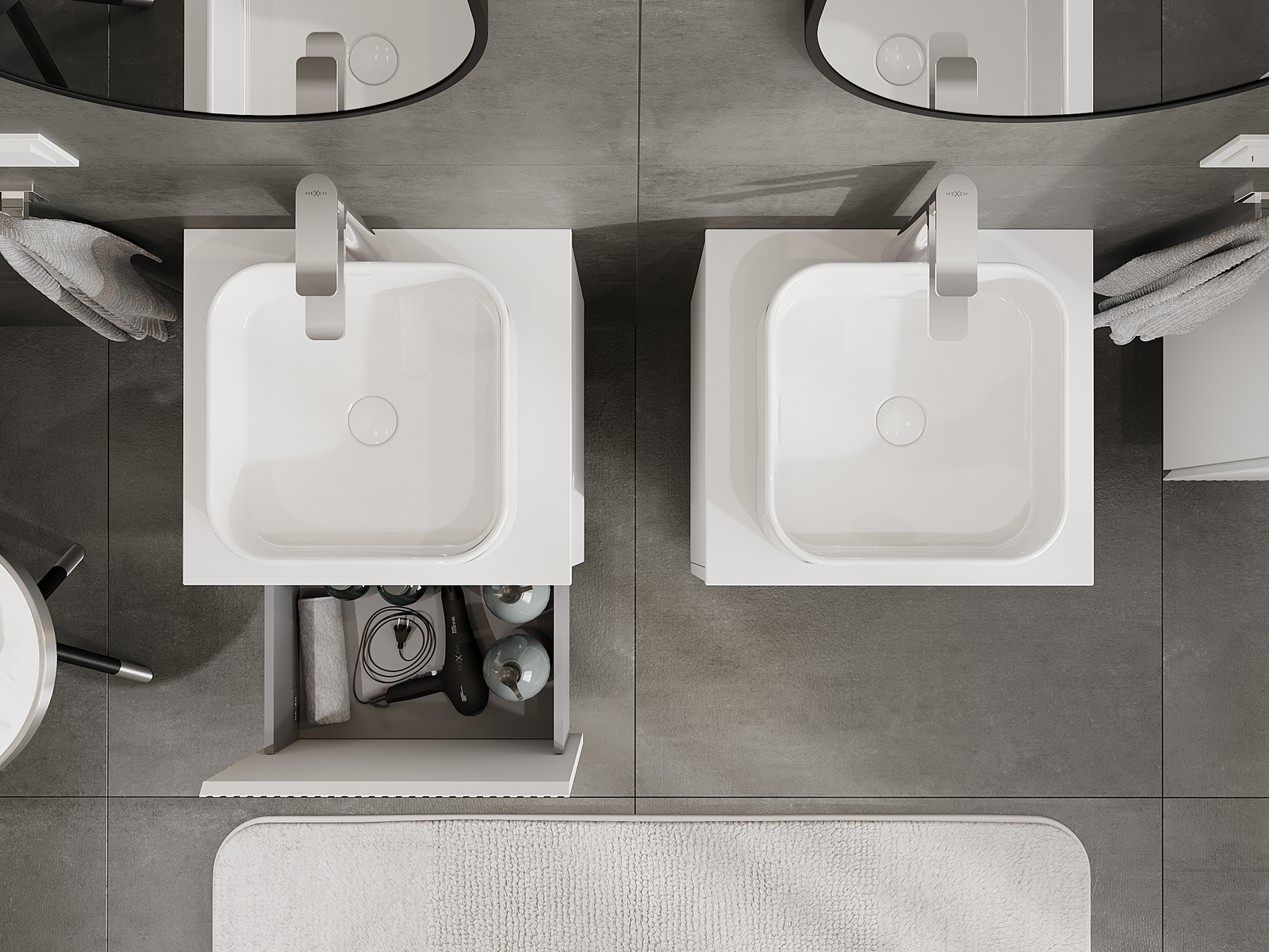 Naše modulární koupelnový nábytek lze kombinovat v různých barevných konfiguracích, což umožňuje plnou personalizaci. Můžete si vybrat jak vzhled, tak funkce jednotlivých prvků, což umožňuje přizpůsobit nábytek vašim stylovým a uživatelským preferencím.