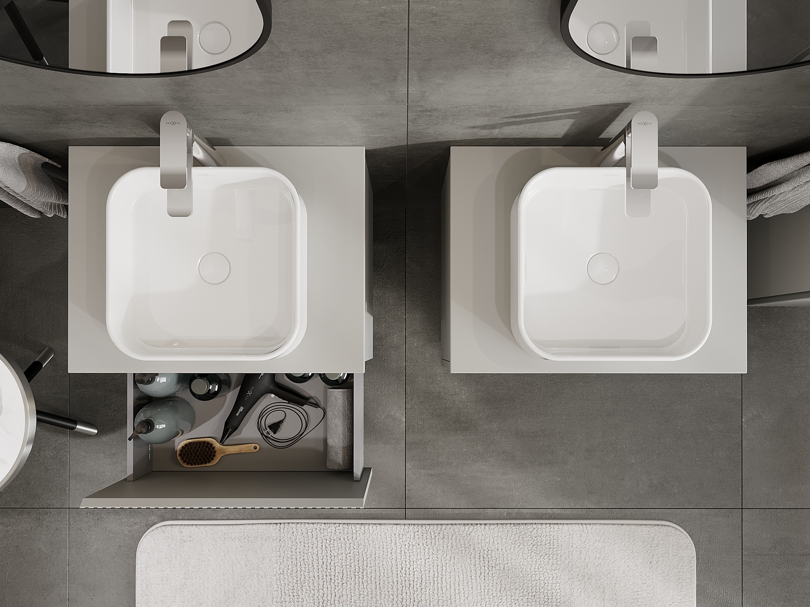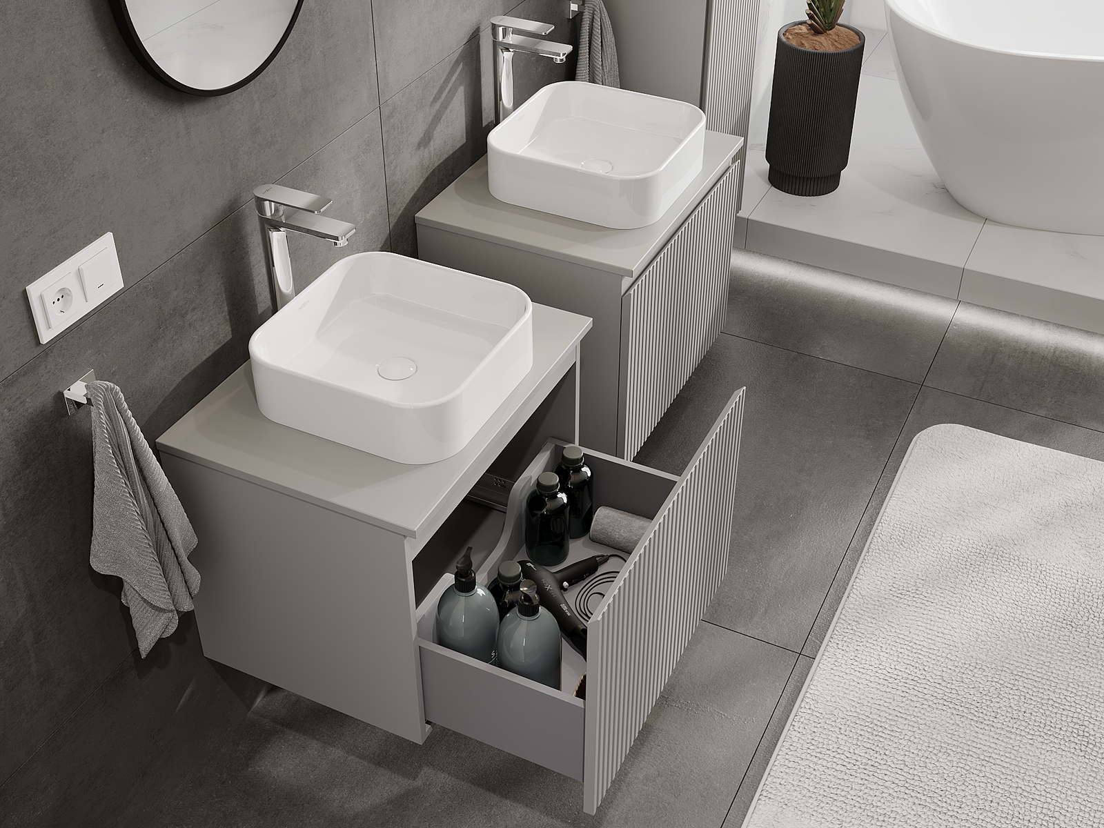 Výřez v zásuvce je navržen tak, aby pojmul sifon, který je nezbytný v instalacích umyvadlových. Díky tomu může být nábytek plně funkčně namontován, aniž by bylo nutné vzdát se prostoru v zásuvce ve prospěch instalace.
