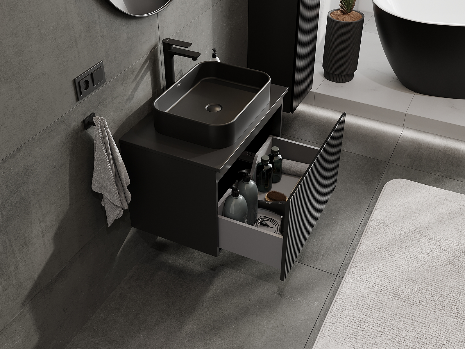 Výřez v zásuvce je navržen tak, aby pojmul sifon, který je nezbytný v instalacích umyvadlových. Díky tomu může být nábytek plně funkčně namontován, aniž by bylo nutné vzdát se prostoru v zásuvce ve prospěch instalace.