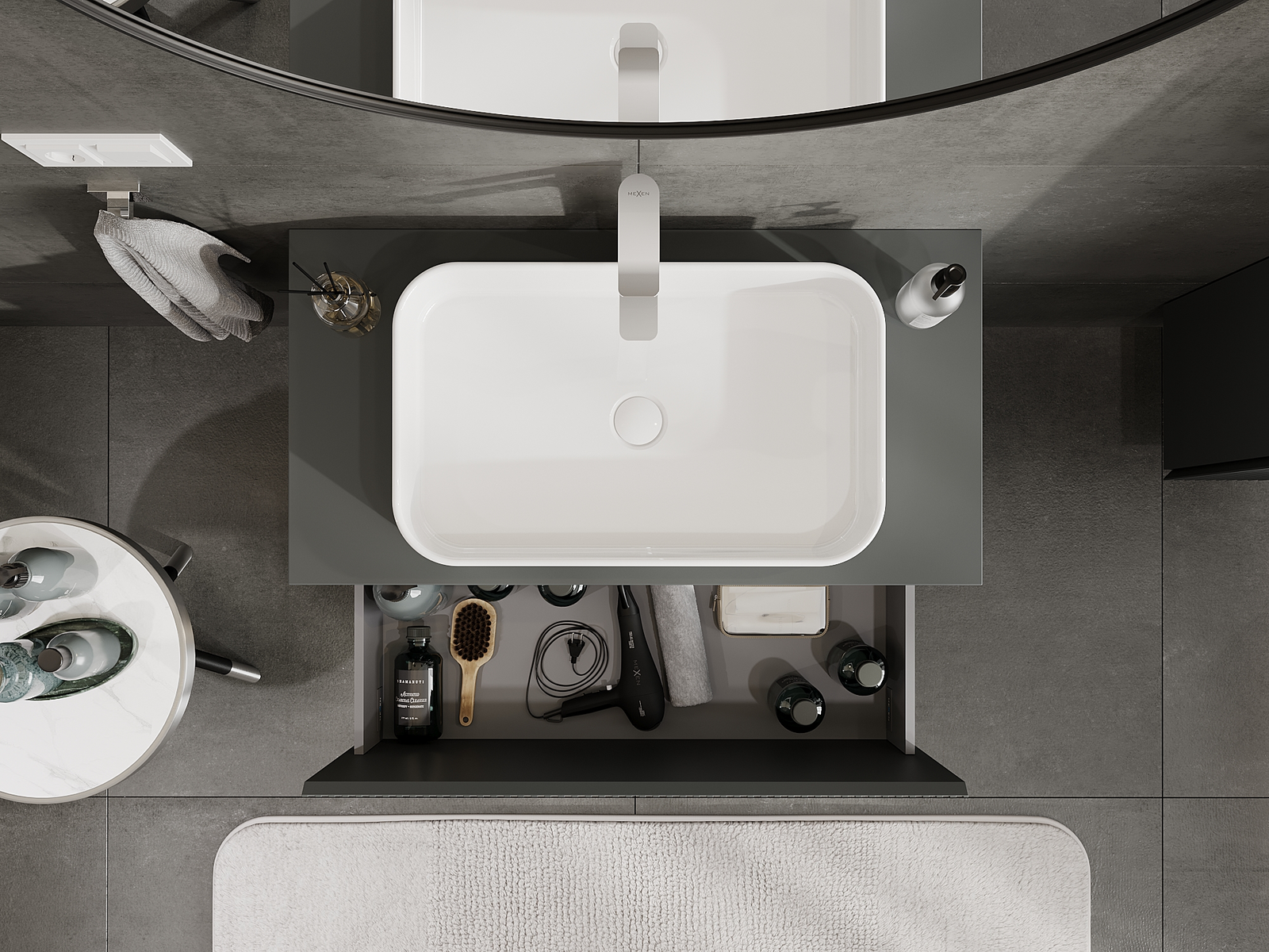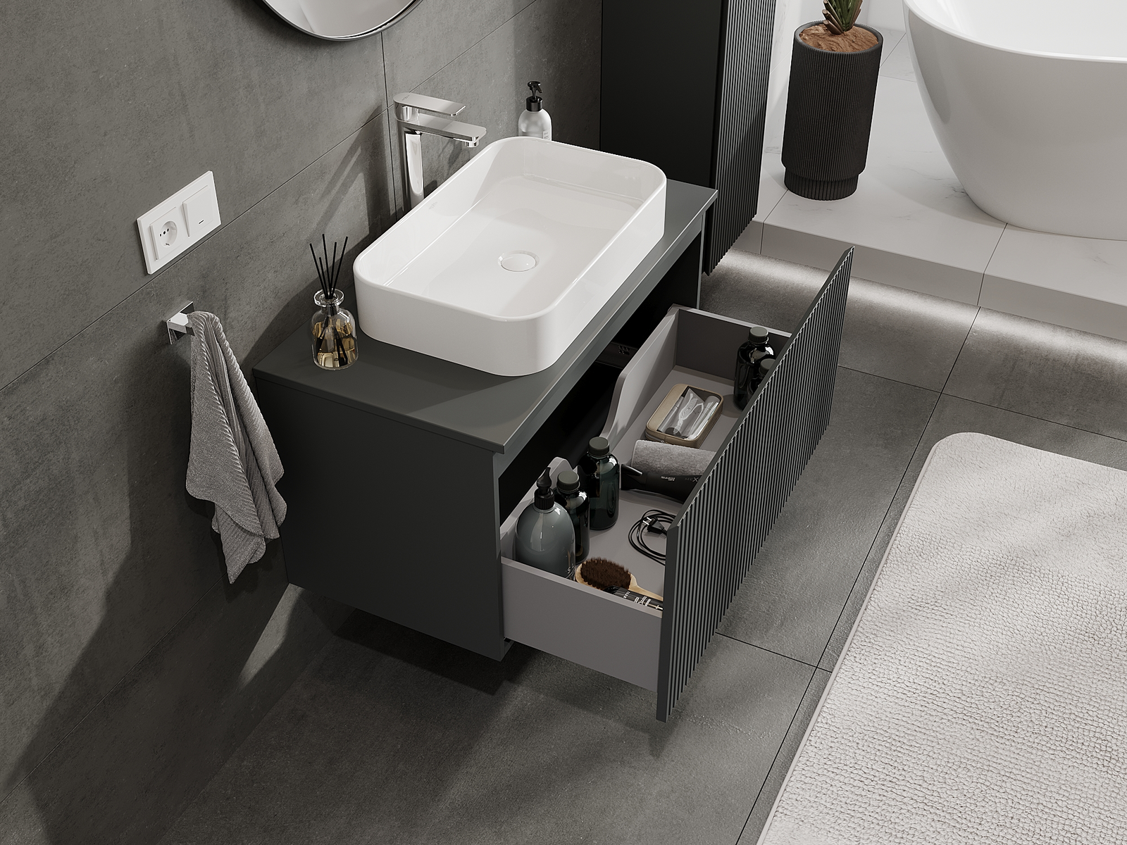 Výřez v zásuvce je navržen tak, aby pojmul sifon, který je nezbytný v instalacích umyvadlových. Díky tomu může být nábytek plně funkčně namontován, aniž by bylo nutné vzdát se prostoru v zásuvce ve prospěch instalace.