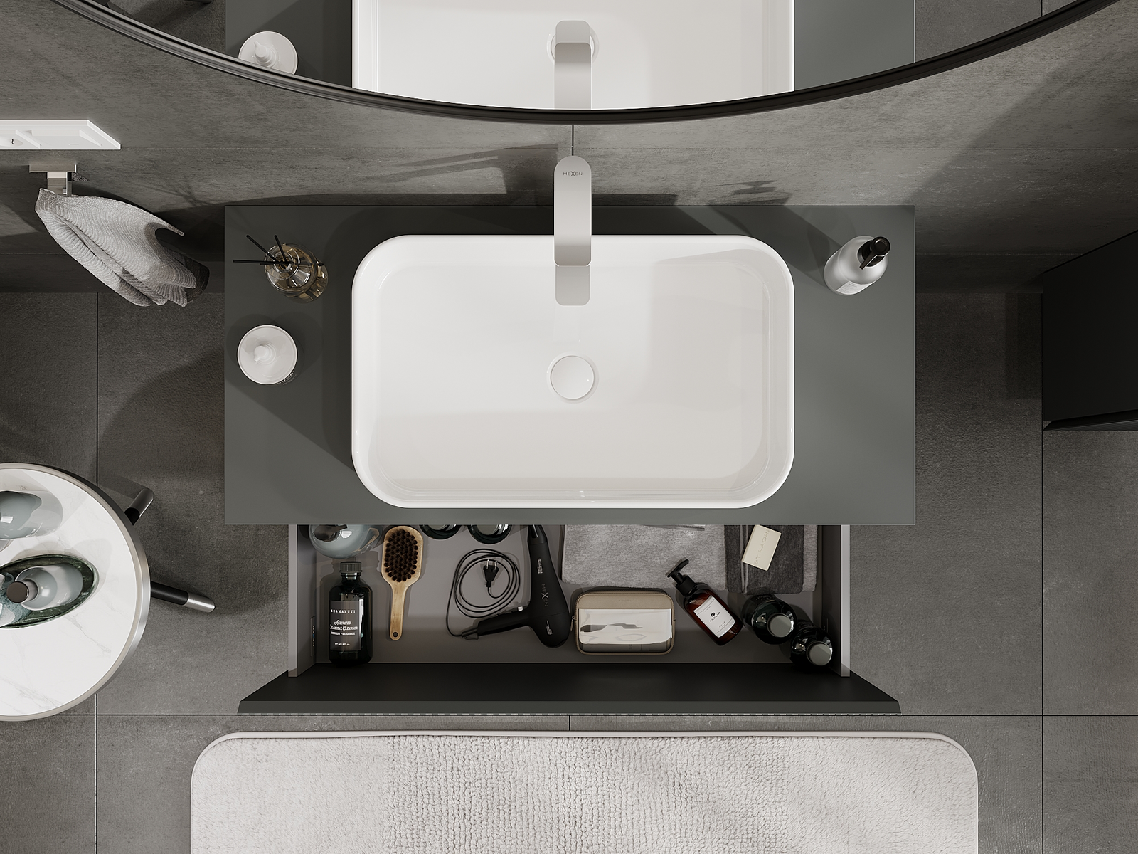 Výřez v zásuvce je navržen tak, aby pojmul sifon, který je nezbytný v instalacích umyvadlových. Díky tomu může být nábytek plně funkčně namontován, aniž by bylo nutné vzdát se prostoru v zásuvce ve prospěch instalace.