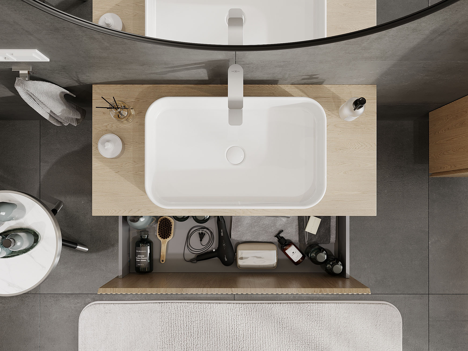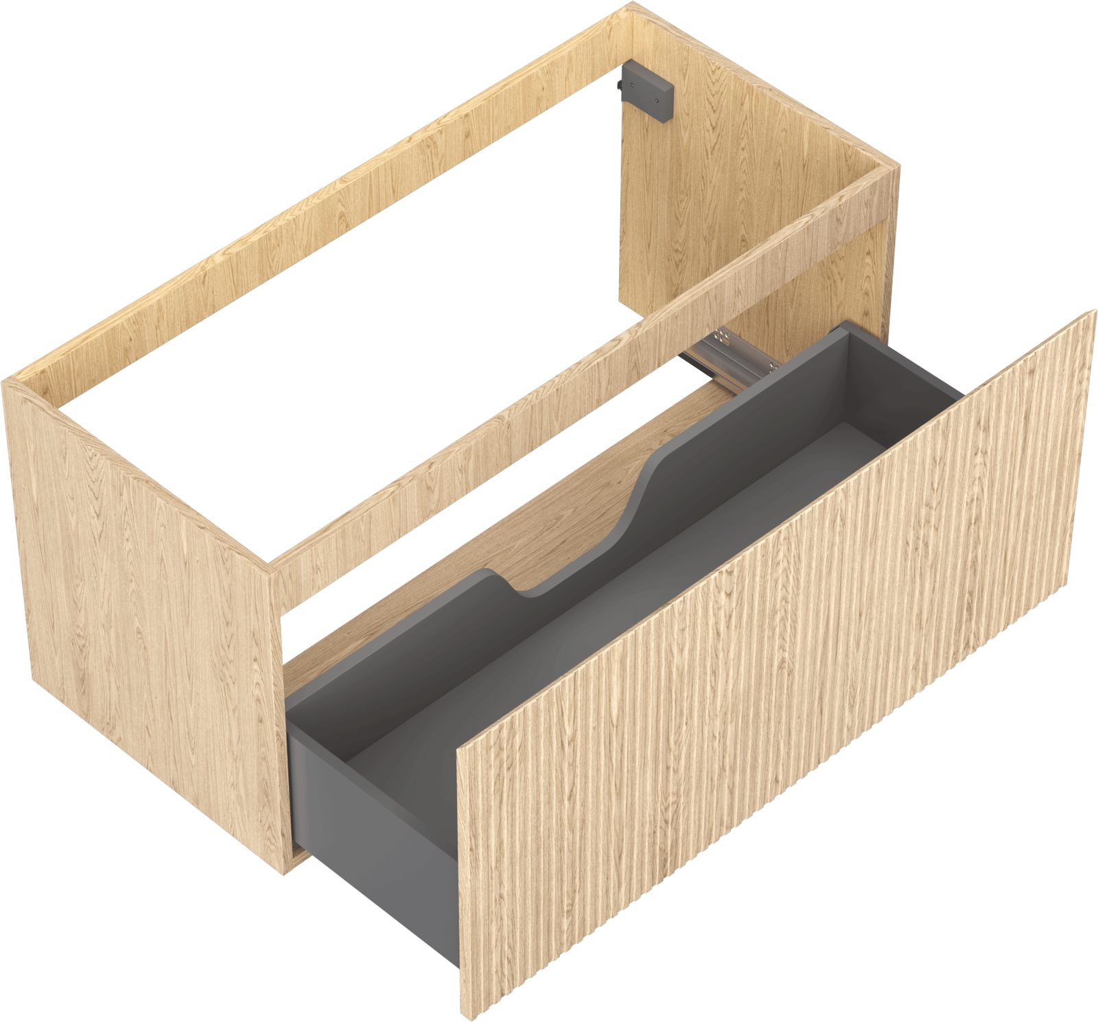 Výřez v zásuvce je navržen tak, aby pojmul sifon, který je nezbytný v instalacích umyvadlových. Díky tomu může být nábytek plně funkčně namontován, aniž by bylo nutné vzdát se prostoru v zásuvce ve prospěch instalace.