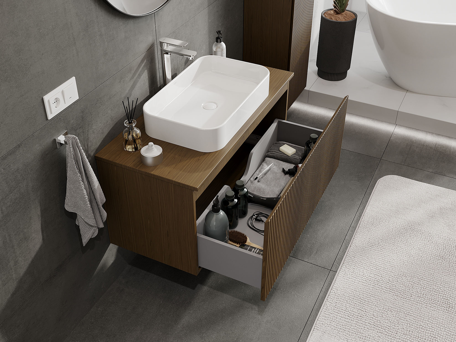 Výřez v zásuvce je navržen tak, aby pojmul sifon, který je nezbytný v instalacích umyvadlových. Díky tomu může být nábytek plně funkčně namontován, aniž by bylo nutné vzdát se prostoru v zásuvce ve prospěch instalace.