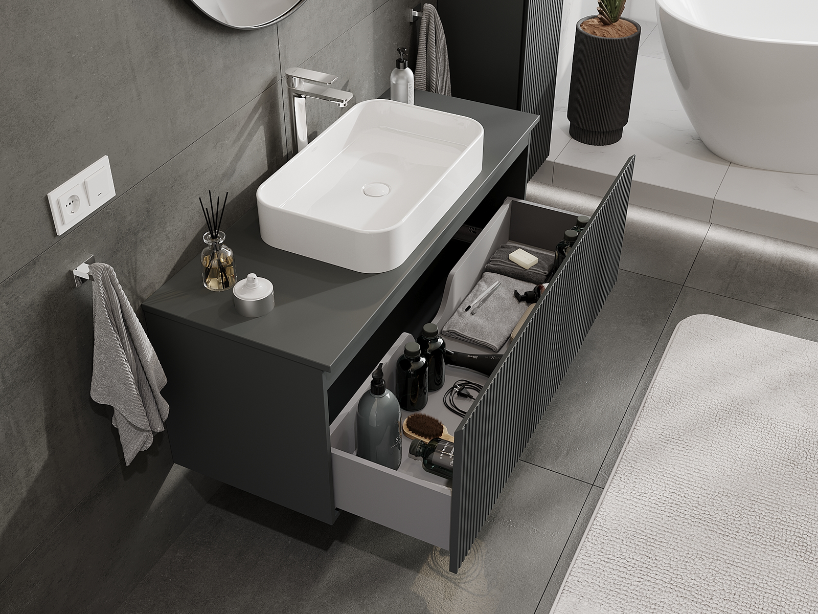 Výřez v zásuvce je navržen tak, aby pojmul sifon, který je nezbytný v instalacích umyvadlových. Díky tomu může být nábytek plně funkčně namontován, aniž by bylo nutné vzdát se prostoru v zásuvce ve prospěch instalace.