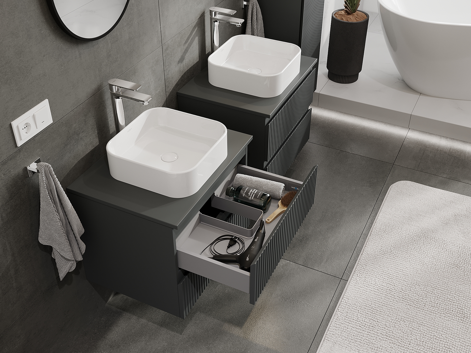 Výřez v zásuvce je navržen tak, aby pojmul sifon, který je nezbytný v instalacích umyvadlových. Díky tomu může být nábytek plně funkčně namontován, aniž by bylo nutné vzdát se prostoru v zásuvce ve prospěch instalace.