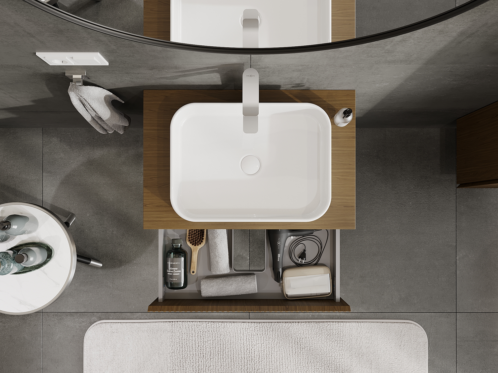 Výřez v zásuvce je navržen tak, aby pojmul sifon, který je nezbytný v instalacích umyvadlových. Díky tomu může být nábytek plně funkčně namontován, aniž by bylo nutné vzdát se prostoru v zásuvce ve prospěch instalace.