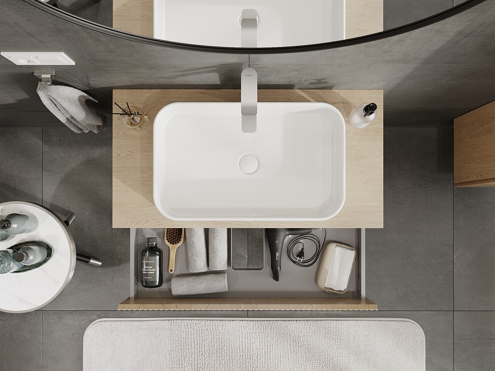 Výřez v zásuvce je navržen tak, aby pojmul sifon, který je nezbytný v instalacích umyvadlových. Díky tomu může být nábytek plně funkčně namontován, aniž by bylo nutné vzdát se prostoru v zásuvce ve prospěch instalace.