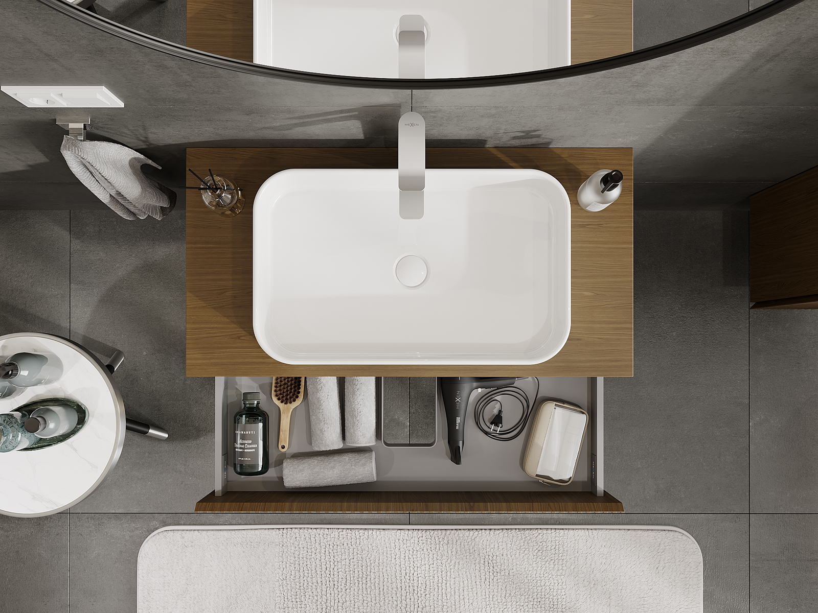 Výřez v zásuvce je navržen tak, aby pojmul sifon, který je nezbytný v instalacích umyvadlových. Díky tomu může být nábytek plně funkčně namontován, aniž by bylo nutné vzdát se prostoru v zásuvce ve prospěch instalace.