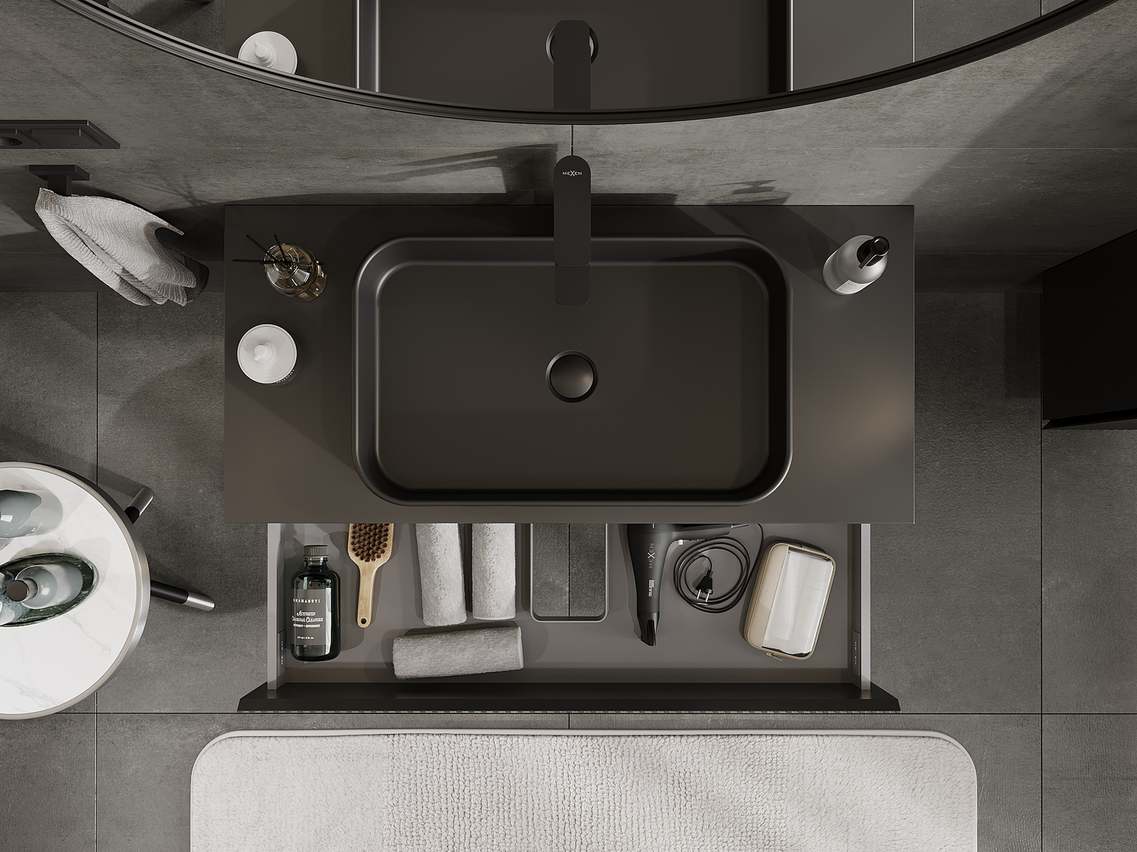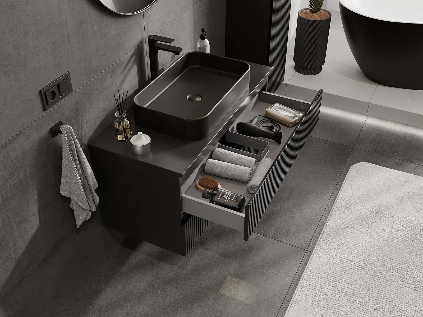 Výřez v zásuvce je navržen tak, aby pojmul sifon, který je nezbytný v instalacích umyvadlových. Díky tomu může být nábytek plně funkčně namontován, aniž by bylo nutné vzdát se prostoru v zásuvce ve prospěch instalace.