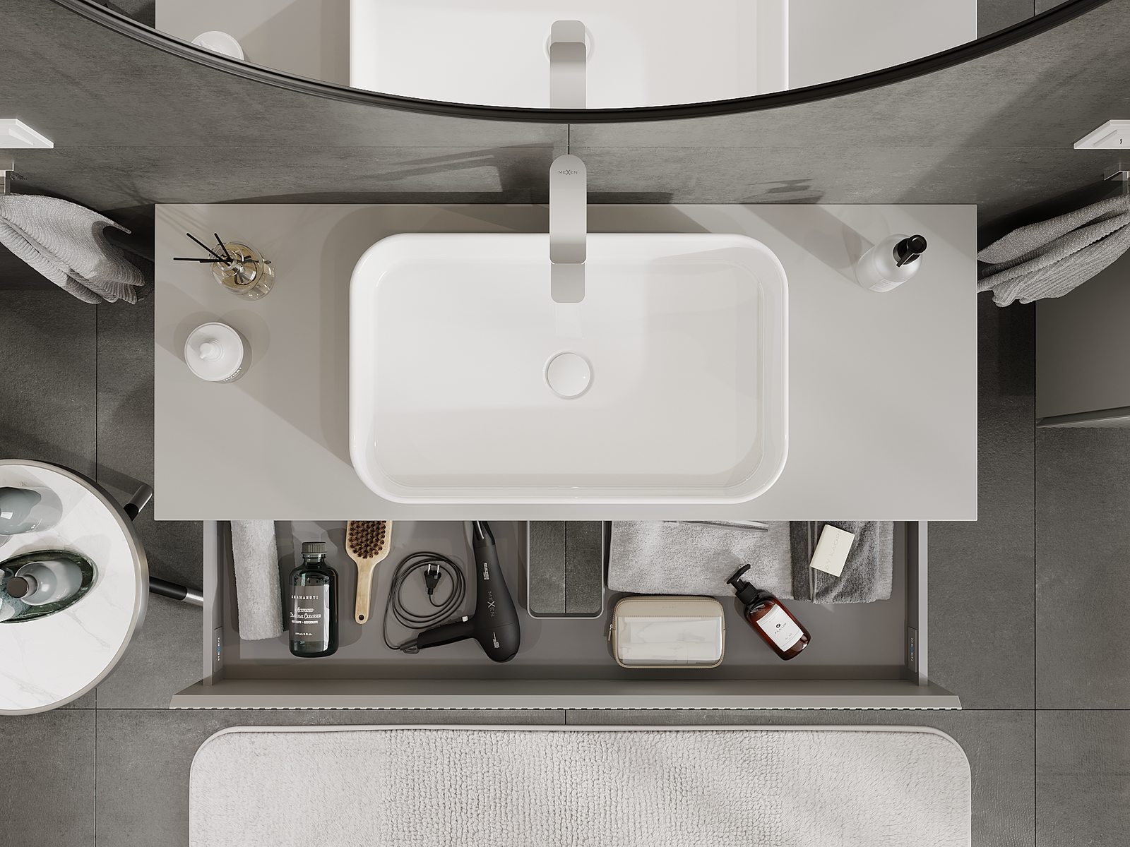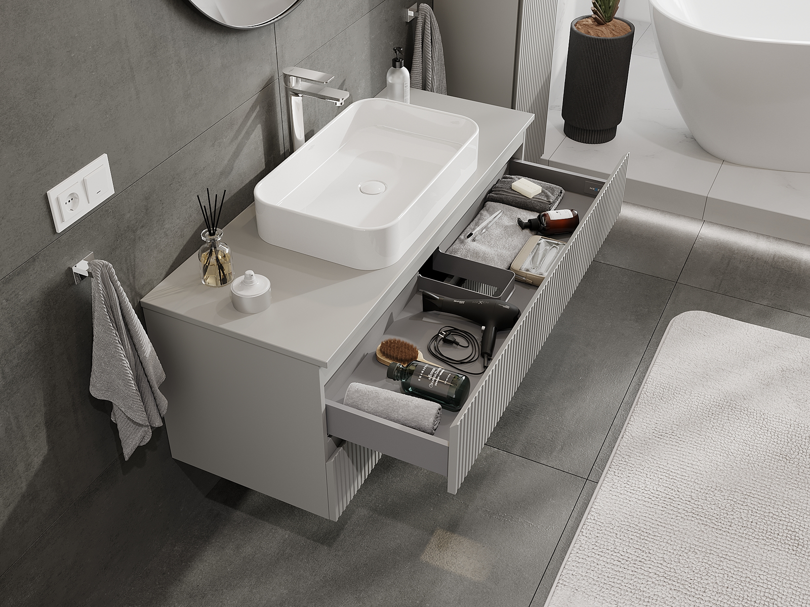 Výřez v zásuvce je navržen tak, aby pojmul sifon, který je nezbytný v instalacích umyvadlových. Díky tomu může být nábytek plně funkčně namontován, aniž by bylo nutné vzdát se prostoru v zásuvce ve prospěch instalace.