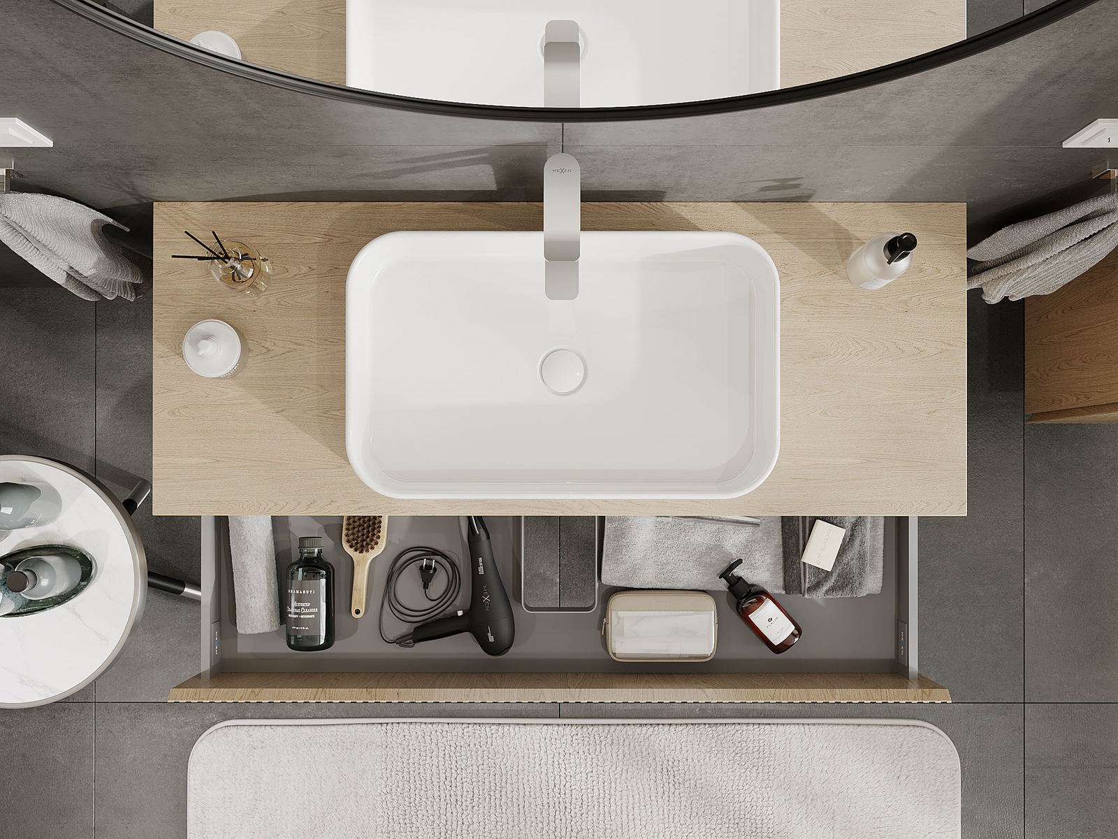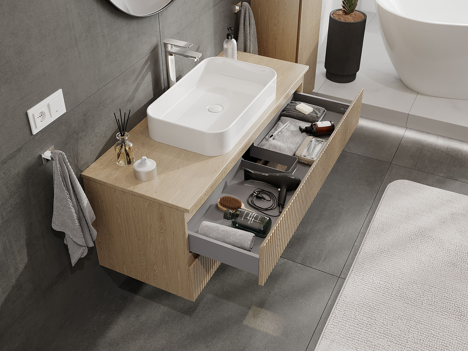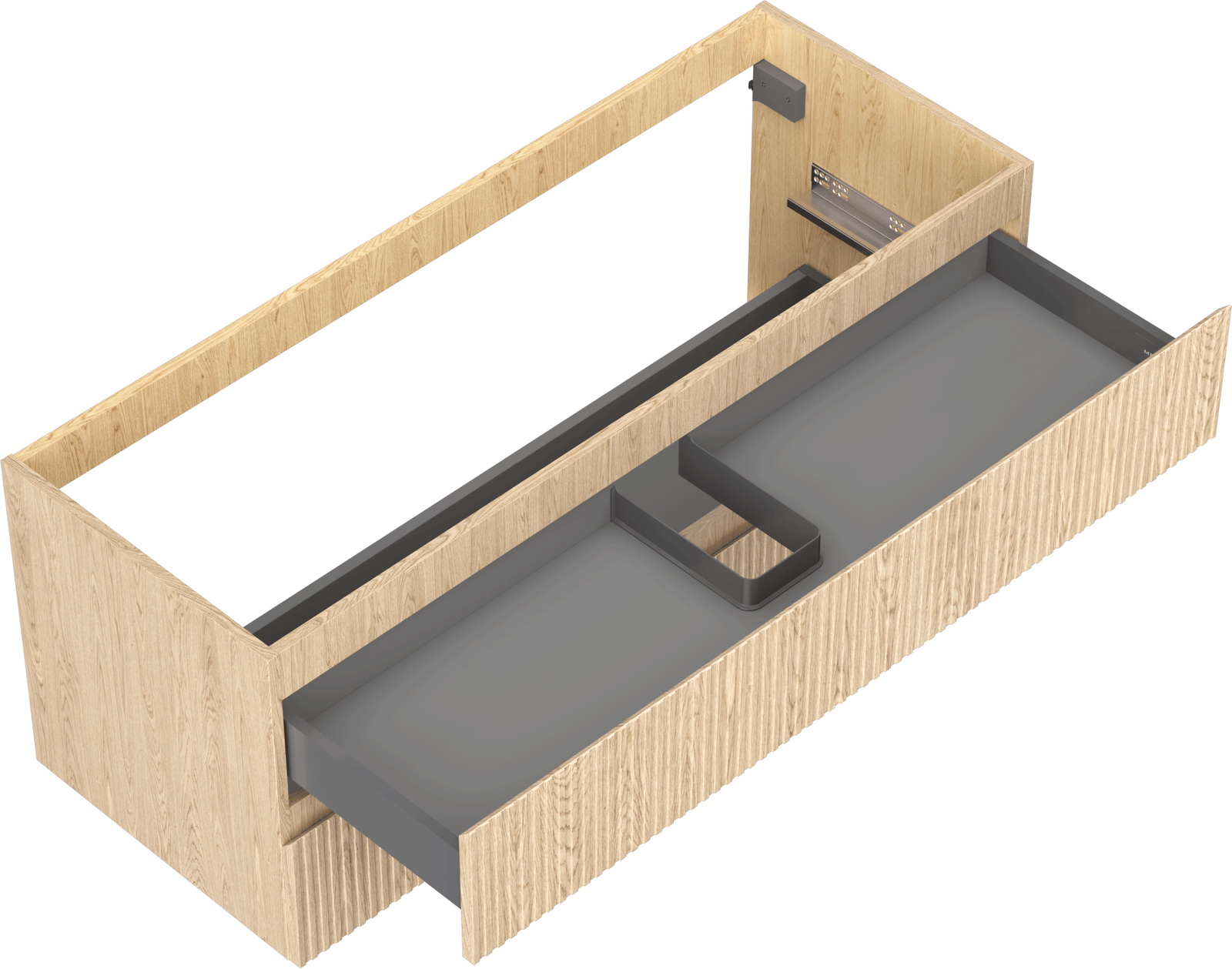 Výřez v zásuvce je navržen tak, aby pojmul sifon, který je nezbytný v instalacích umyvadlových. Díky tomu může být nábytek plně funkčně namontován, aniž by bylo nutné vzdát se prostoru v zásuvce ve prospěch instalace.