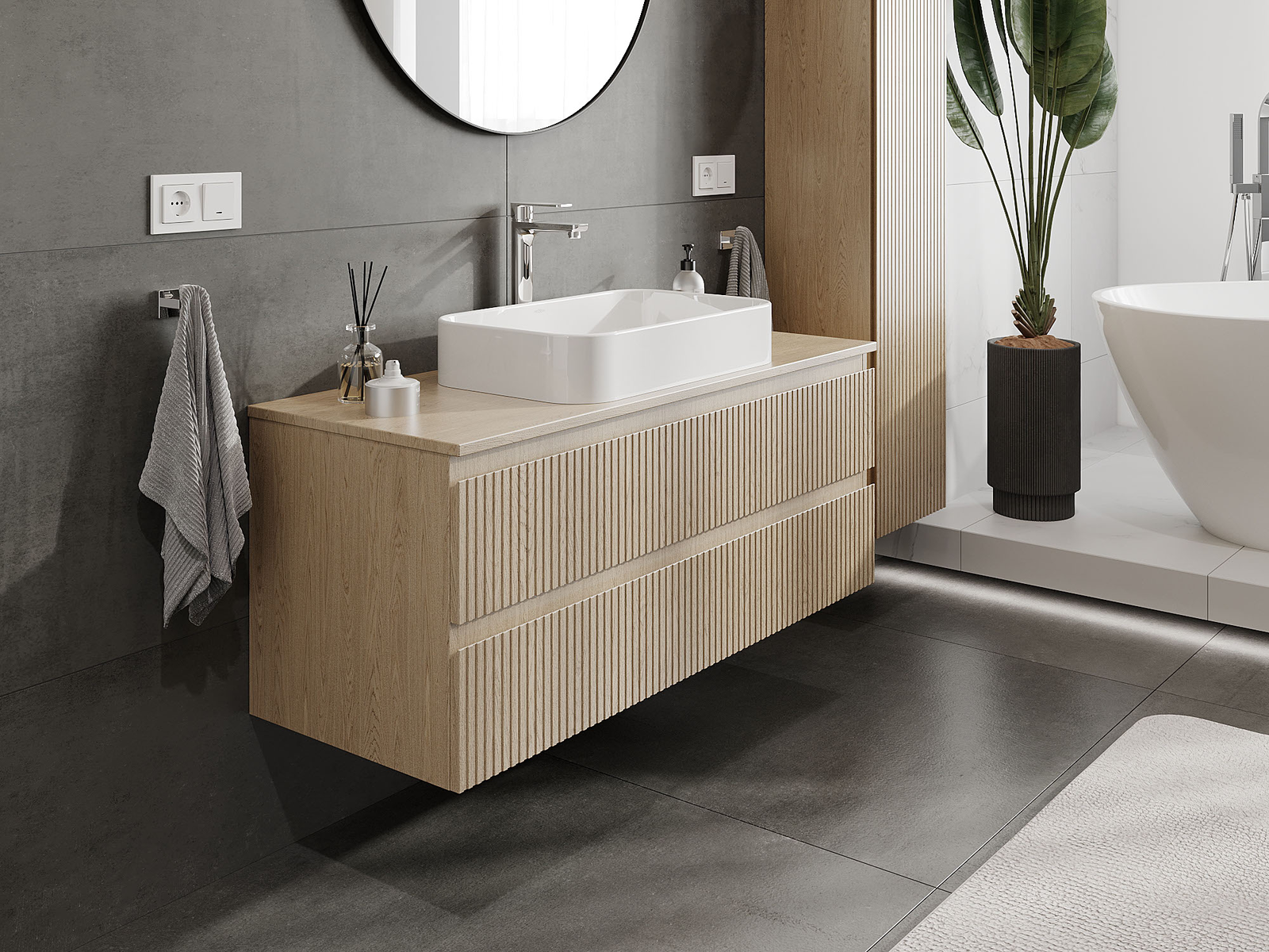 Naše modulární koupelnový nábytek lze kombinovat v různých barevných konfiguracích, což umožňuje plnou personalizaci. Můžete si vybrat jak vzhled, tak funkce jednotlivých prvků, což umožňuje přizpůsobit nábytek vašim stylovým a uživatelským preferencím.