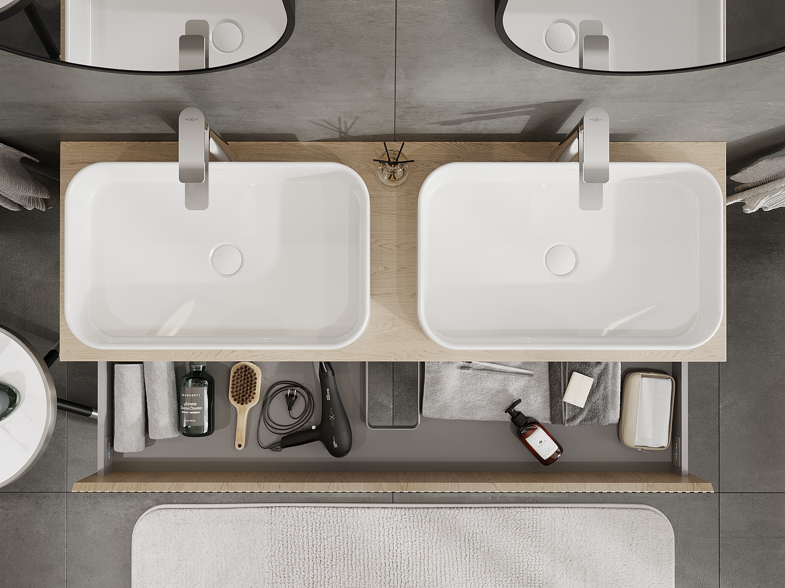 Výřez v zásuvce je navržen tak, aby pojmul sifon, který je nezbytný v instalacích umyvadlových. Díky tomu může být nábytek plně funkčně namontován, aniž by bylo nutné vzdát se prostoru v zásuvce ve prospěch instalace.
