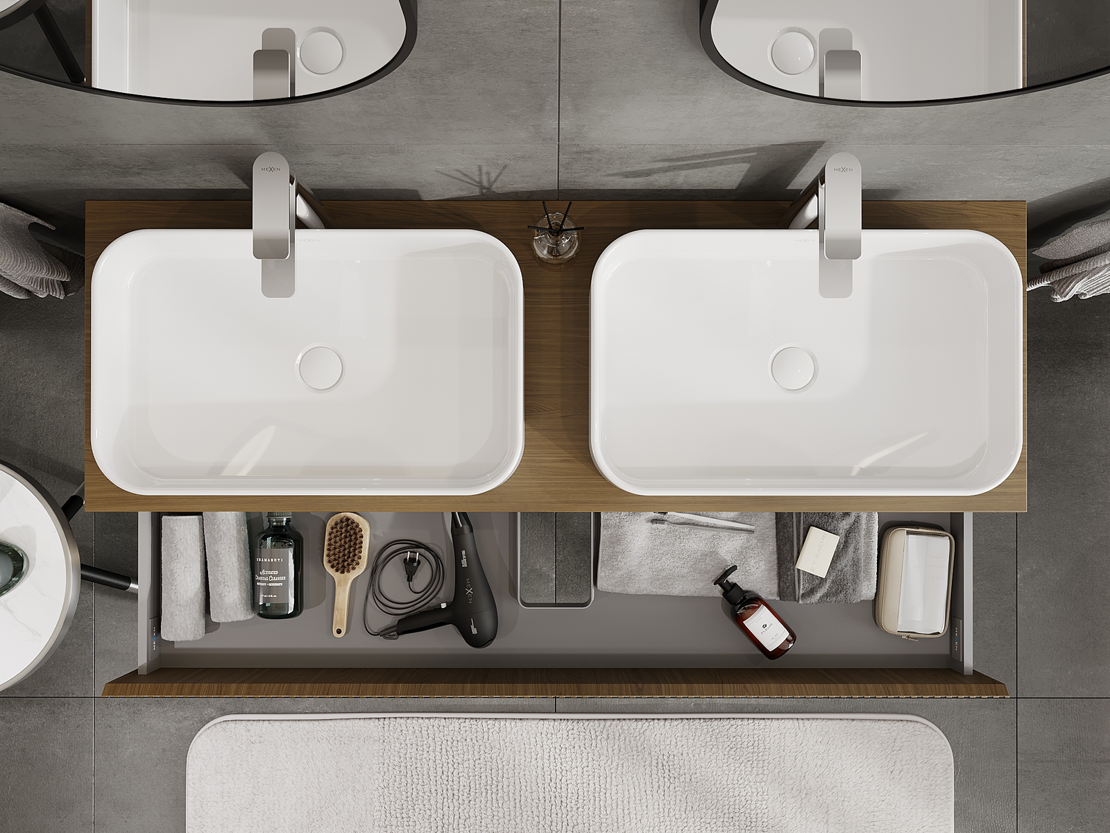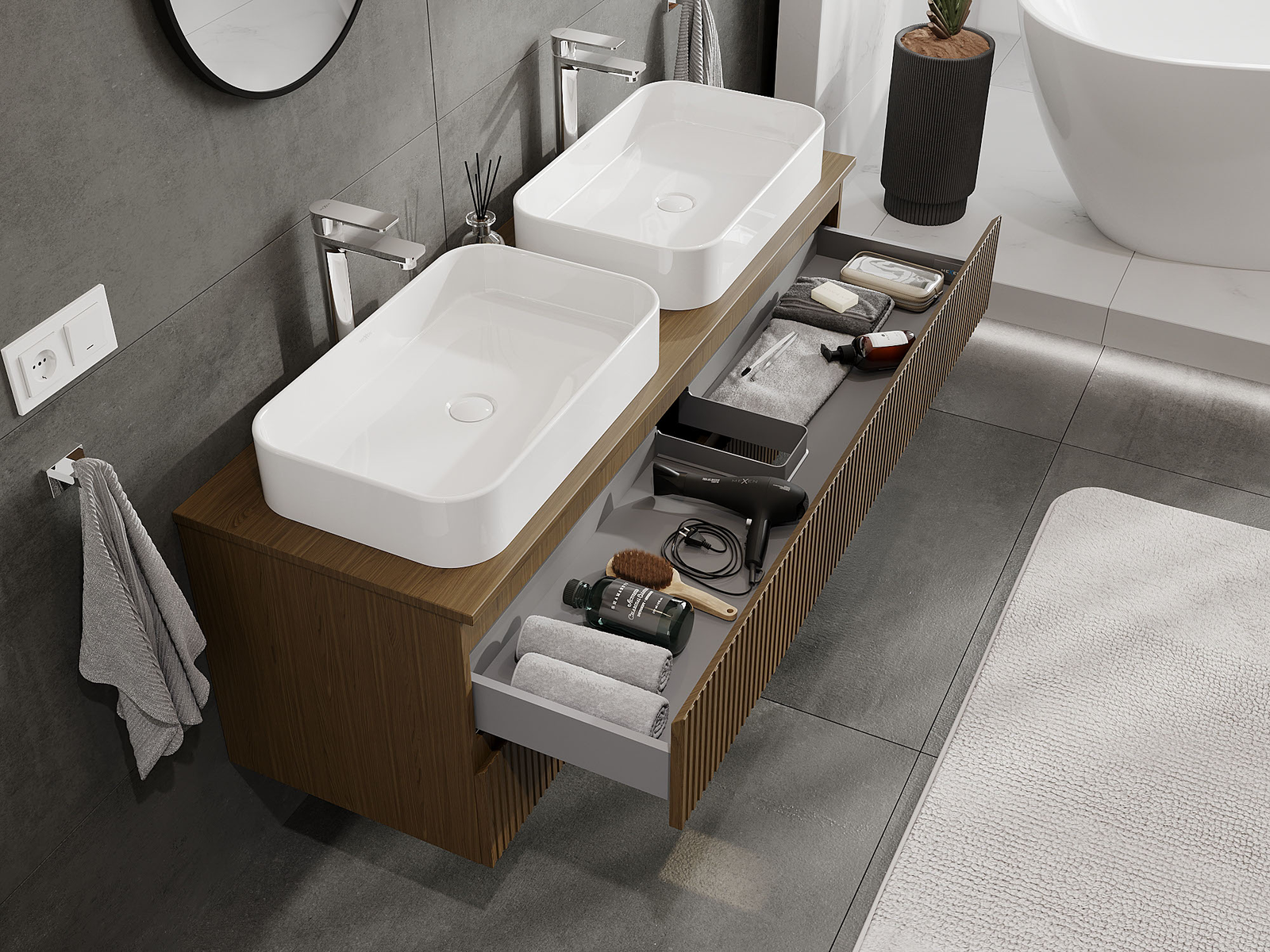 Výřez v zásuvce je navržen tak, aby pojmul sifon, který je nezbytný v instalacích umyvadlových. Díky tomu může být nábytek plně funkčně namontován, aniž by bylo nutné vzdát se prostoru v zásuvce ve prospěch instalace.