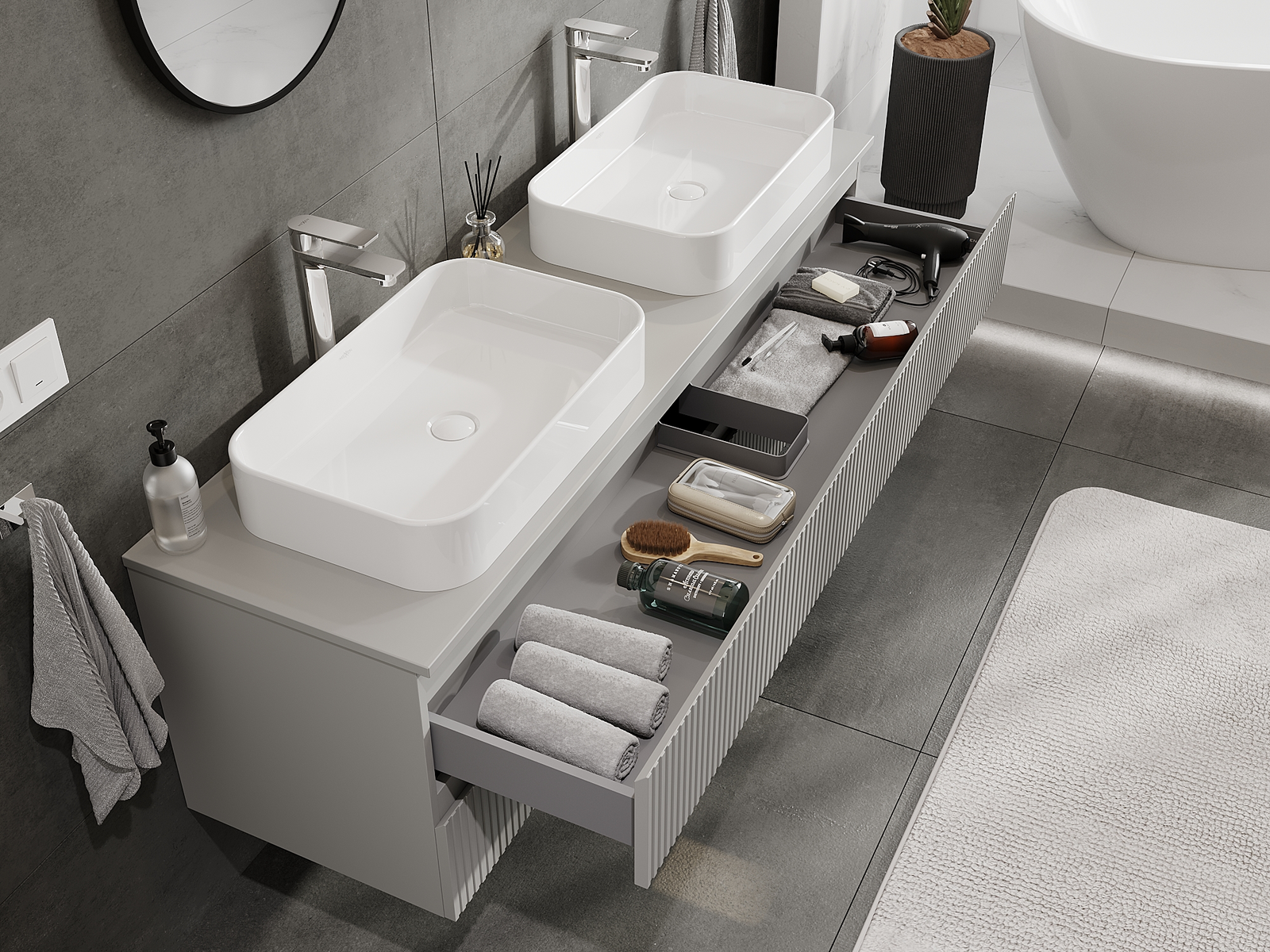 Naše modulární koupelnový nábytek lze kombinovat v různých barevných konfiguracích, což umožňuje plnou personalizaci. Můžete si vybrat jak vzhled, tak funkce jednotlivých prvků, což umožňuje přizpůsobit nábytek vašim stylovým a uživatelským preferencím.