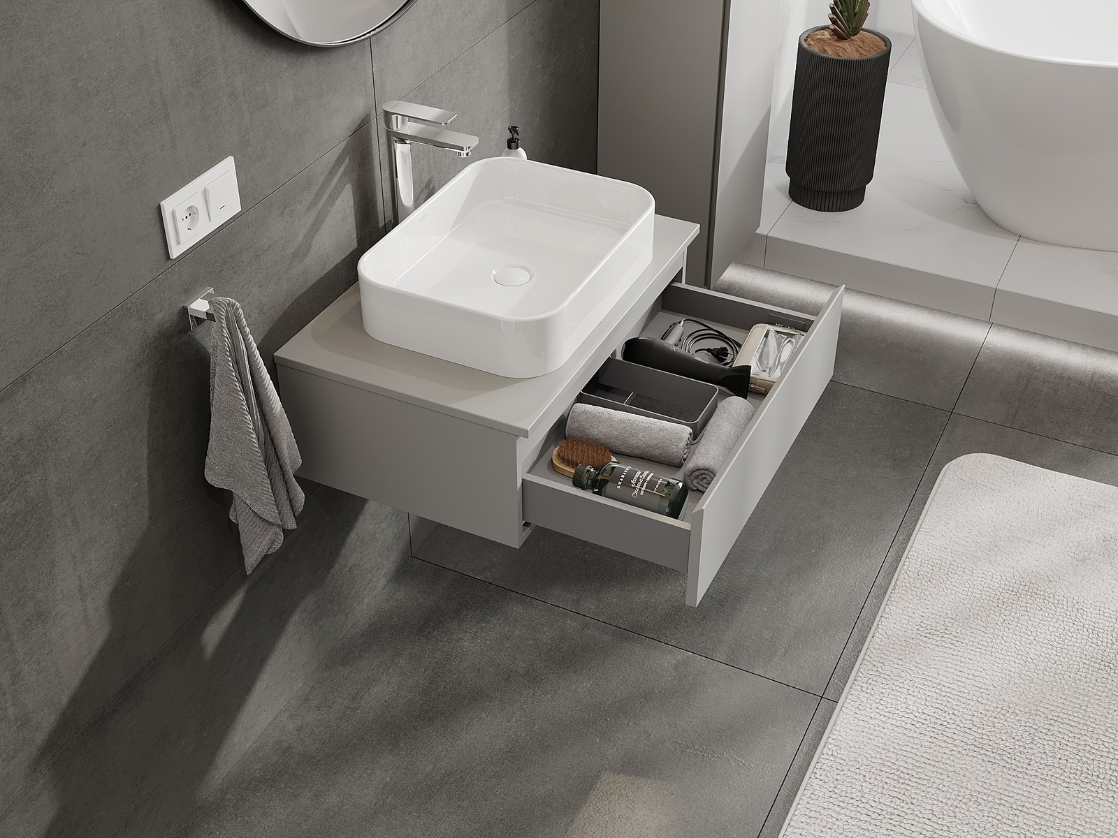 Výřez v zásuvce je navržen tak, aby pojmul sifon, který je nezbytný v instalacích umyvadlových. Díky tomu může být nábytek plně funkčně namontován, aniž by bylo nutné vzdát se prostoru v zásuvce ve prospěch instalace.