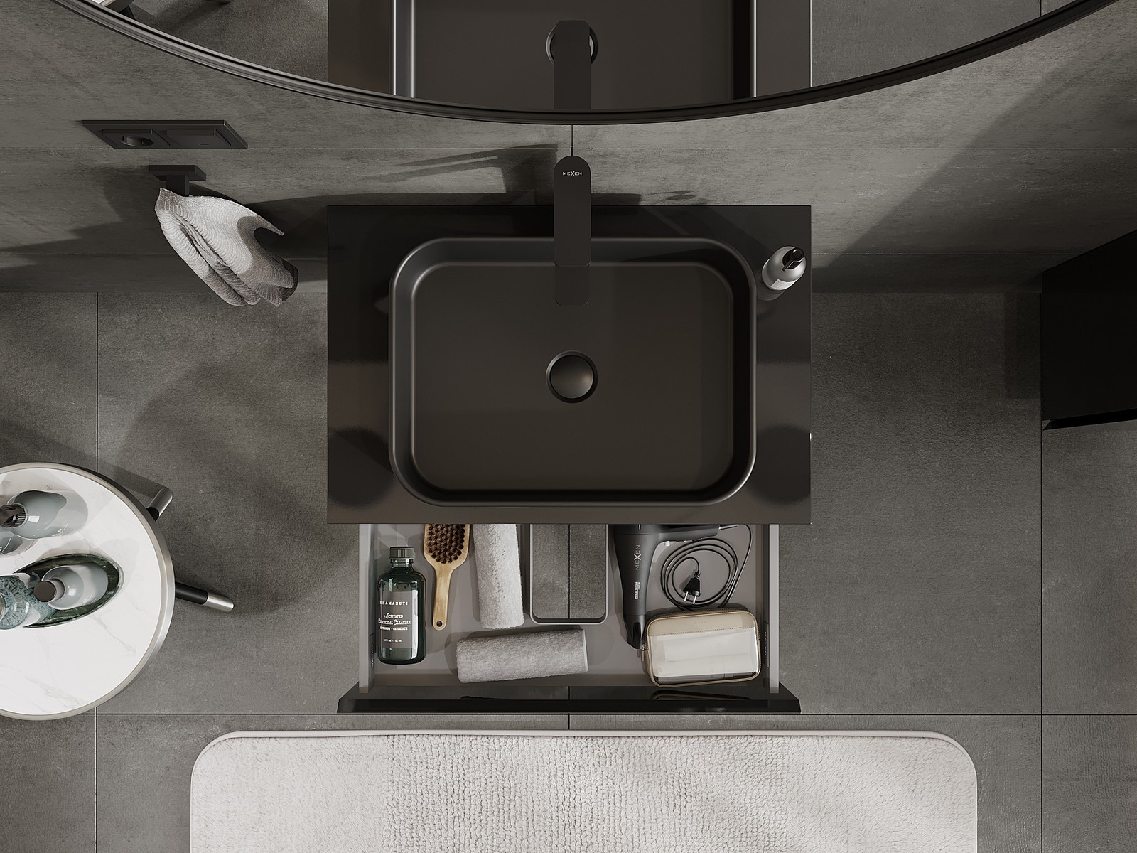 Výřez v zásuvce je navržen tak, aby pojmul sifon, který je nezbytný v instalacích umyvadlových. Díky tomu může být nábytek plně funkčně namontován, aniž by bylo nutné vzdát se prostoru v zásuvce ve prospěch instalace.