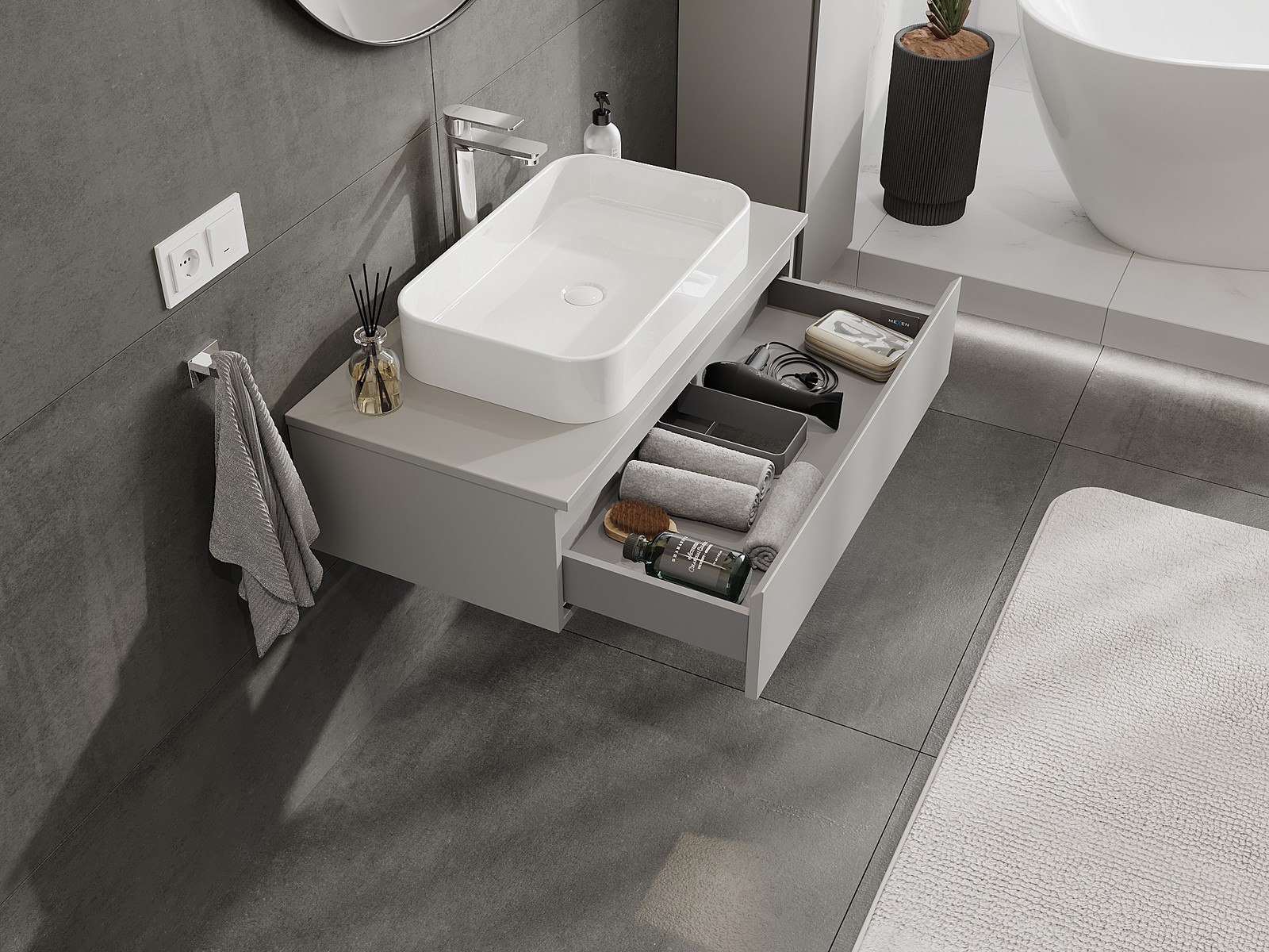 Výřez v zásuvce je navržen tak, aby pojmul sifon, který je nezbytný v instalacích umyvadlových. Díky tomu může být nábytek plně funkčně namontován, aniž by bylo nutné vzdát se prostoru v zásuvce ve prospěch instalace.