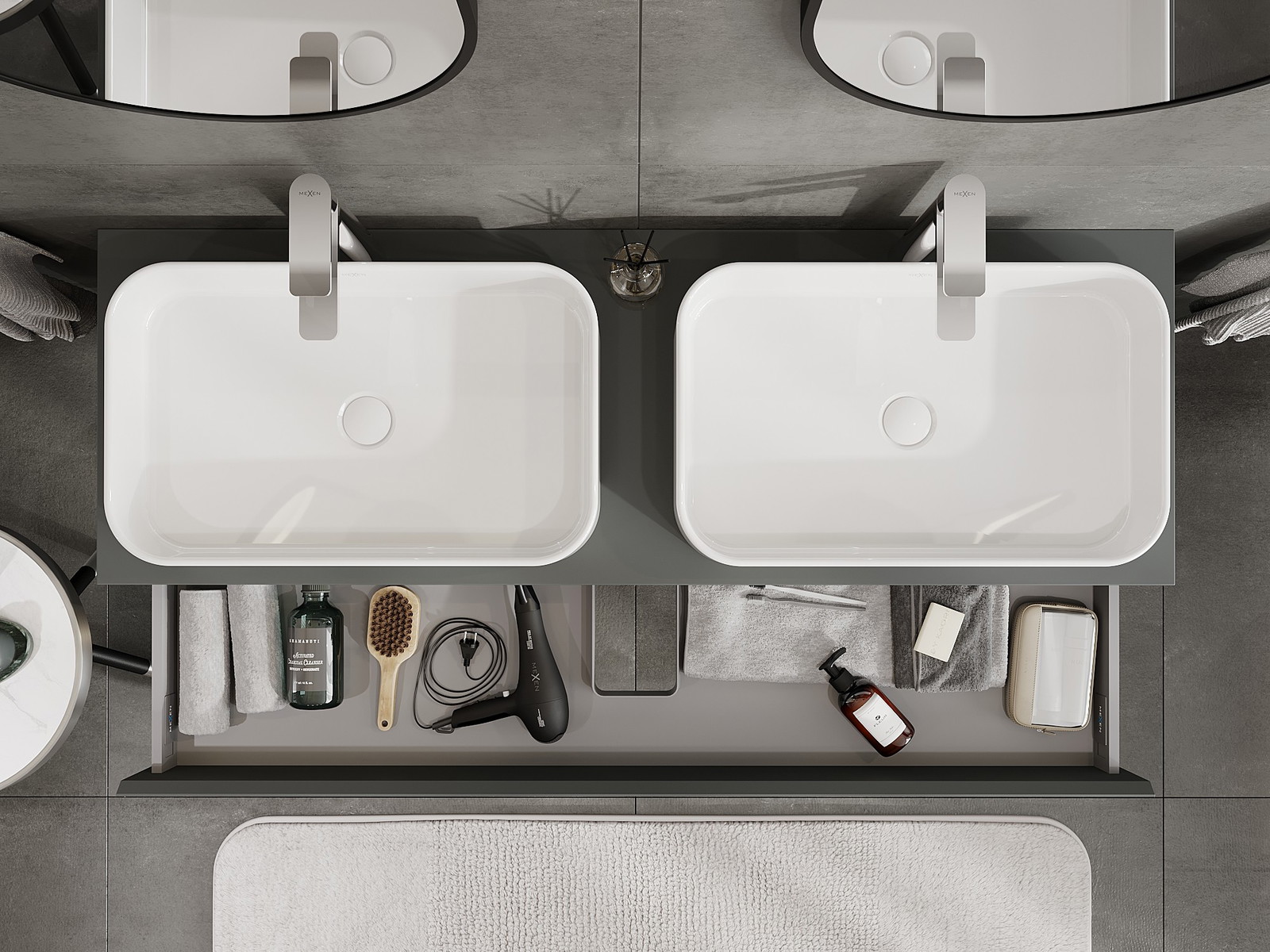Výřez v zásuvce je navržen tak, aby pojmul sifon, který je nezbytný v instalacích umyvadlových. Díky tomu může být nábytek plně funkčně namontován, aniž by bylo nutné vzdát se prostoru v zásuvce ve prospěch instalace.