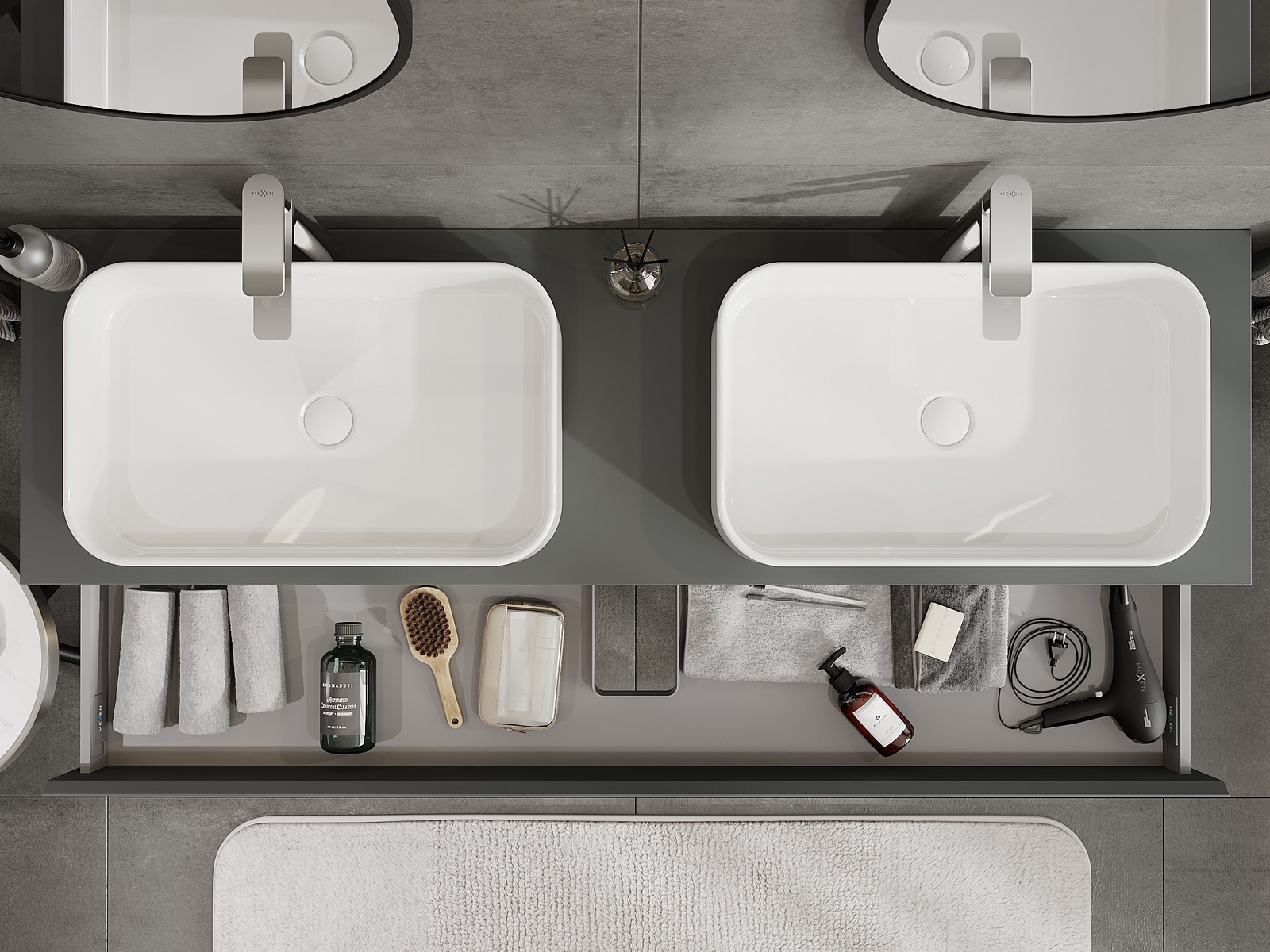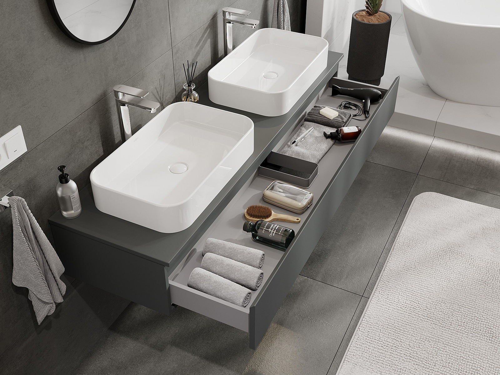 Naše modulární koupelnový nábytek lze kombinovat v různých barevných konfiguracích, což umožňuje plnou personalizaci. Můžete si vybrat jak vzhled, tak funkce jednotlivých prvků, což umožňuje přizpůsobit nábytek vašim stylovým a uživatelským preferencím.