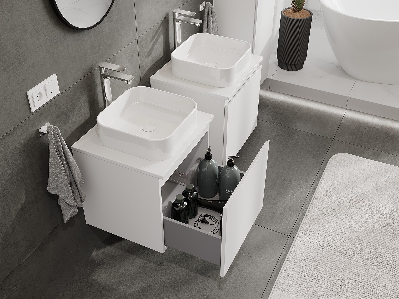 Výřez v zásuvce je navržen tak, aby pojmul sifon, který je nezbytný v instalacích umyvadlových. Díky tomu může být nábytek plně funkčně namontován, aniž by bylo nutné vzdát se prostoru v zásuvce ve prospěch instalace.
