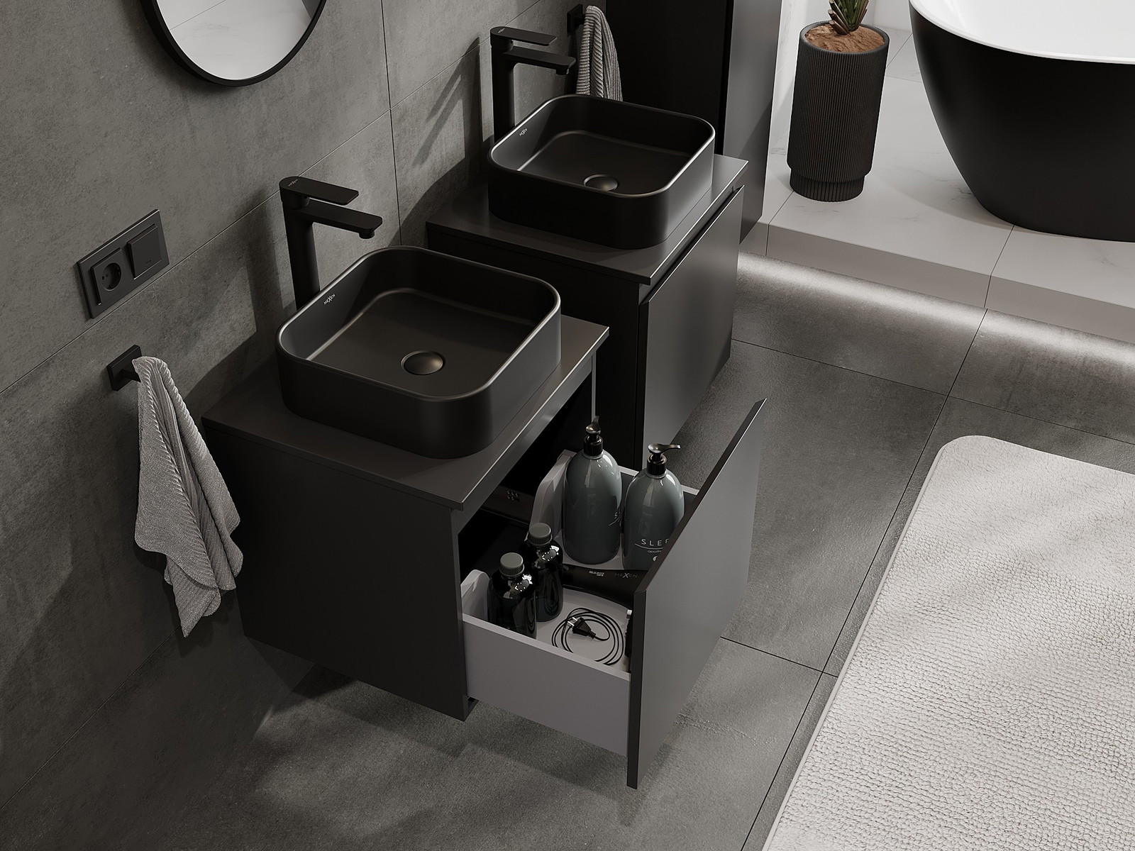 Výřez v zásuvce je navržen tak, aby pojmul sifon, který je nezbytný v instalacích umyvadlových. Díky tomu může být nábytek plně funkčně namontován, aniž by bylo nutné vzdát se prostoru v zásuvce ve prospěch instalace.