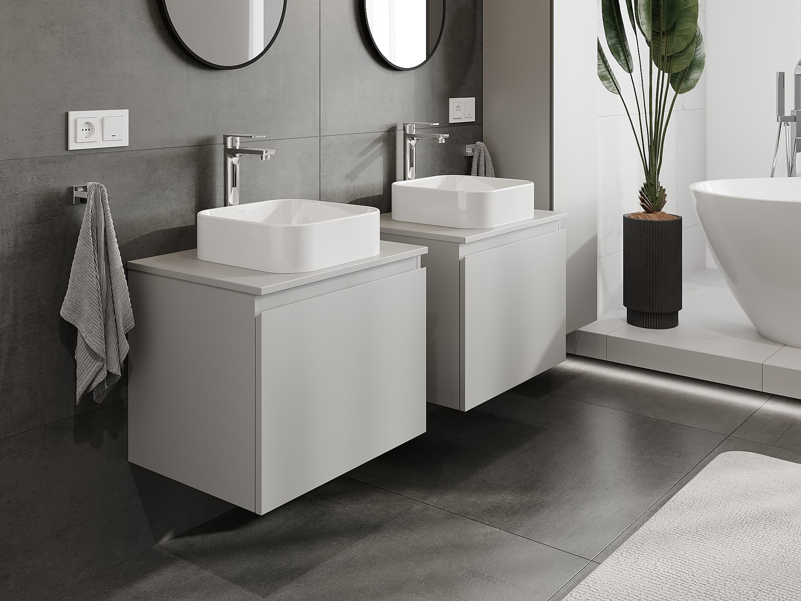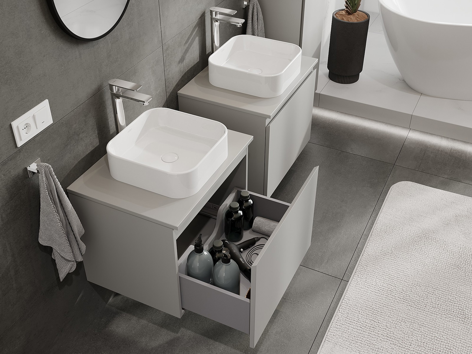 Naše modulární koupelnový nábytek lze kombinovat v různých barevných konfiguracích, což umožňuje plnou personalizaci. Můžete si vybrat jak vzhled, tak funkce jednotlivých prvků, což umožňuje přizpůsobit nábytek vašim stylovým a uživatelským preferencím.