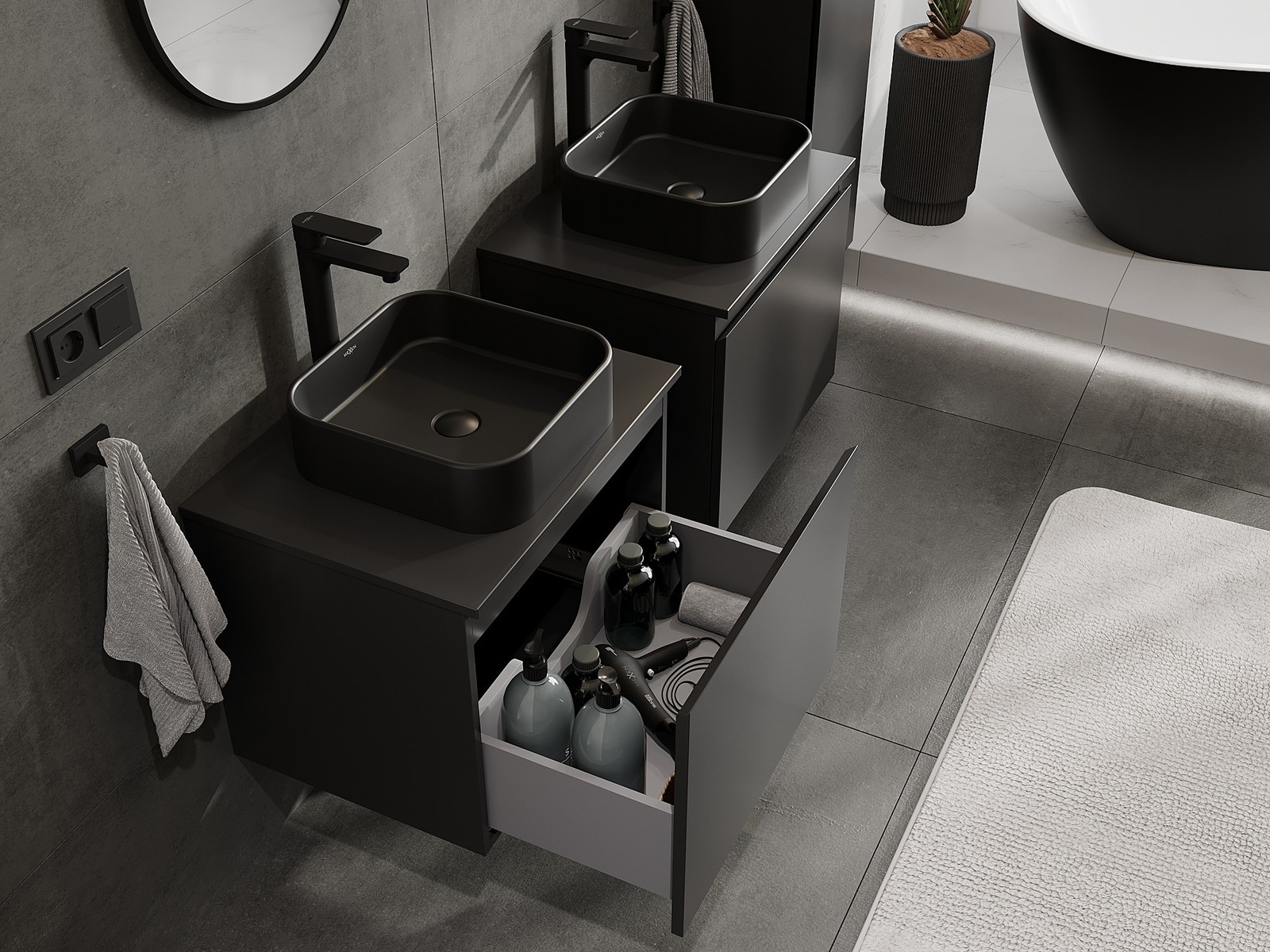Výřez v zásuvce je navržen tak, aby pojmul sifon, který je nezbytný v instalacích umyvadlových. Díky tomu může být nábytek plně funkčně namontován, aniž by bylo nutné vzdát se prostoru v zásuvce ve prospěch instalace.