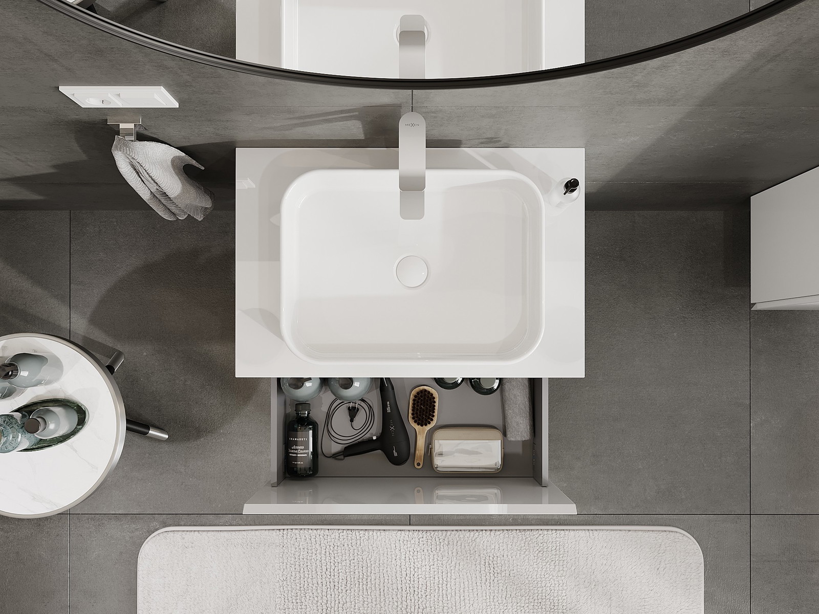 Výřez v zásuvce je navržen tak, aby pojmul sifon, který je nezbytný v instalacích umyvadlových. Díky tomu může být nábytek plně funkčně namontován, aniž by bylo nutné vzdát se prostoru v zásuvce ve prospěch instalace.