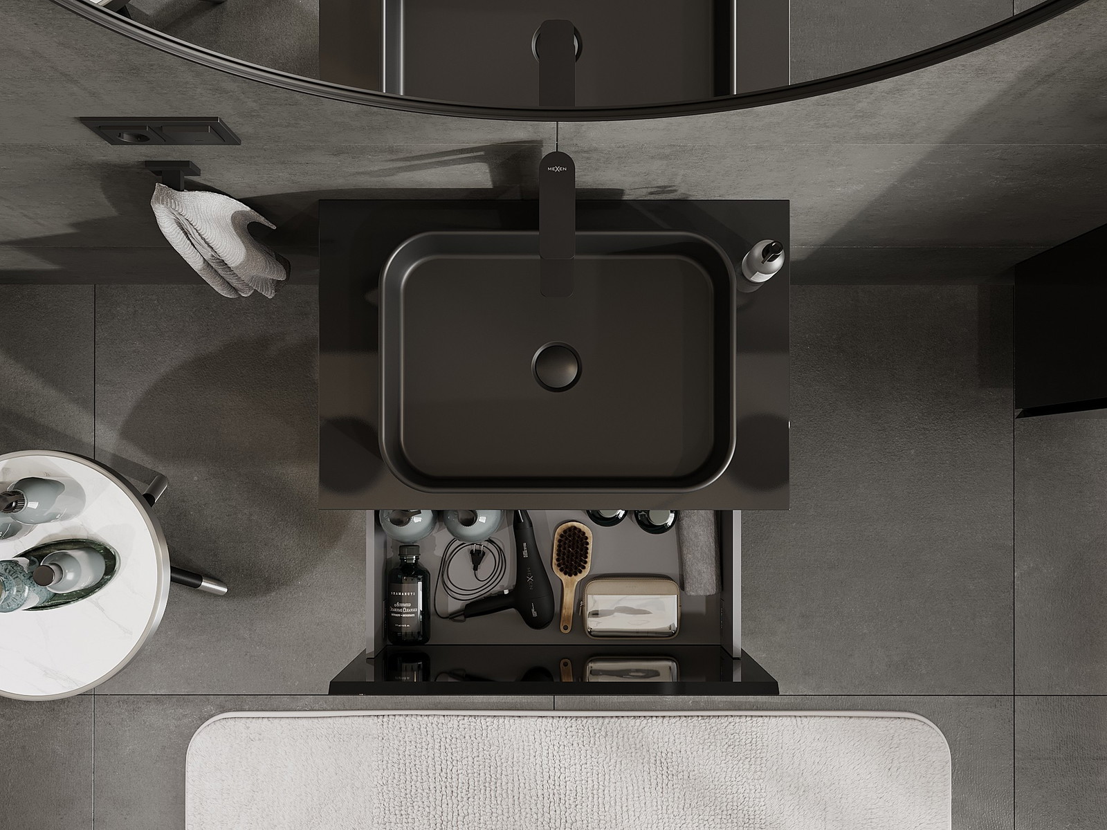 Výřez v zásuvce je navržen tak, aby pojmul sifon, který je nezbytný v instalacích umyvadlových. Díky tomu může být nábytek plně funkčně namontován, aniž by bylo nutné vzdát se prostoru v zásuvce ve prospěch instalace.