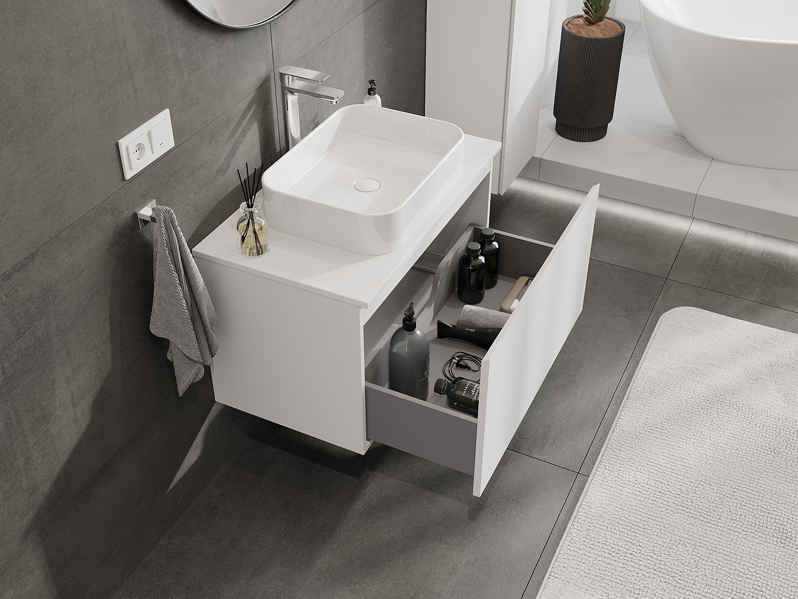 Výřez v zásuvce je navržen tak, aby pojmul sifon, který je nezbytný v instalacích umyvadlových. Díky tomu může být nábytek plně funkčně namontován, aniž by bylo nutné vzdát se prostoru v zásuvce ve prospěch instalace.